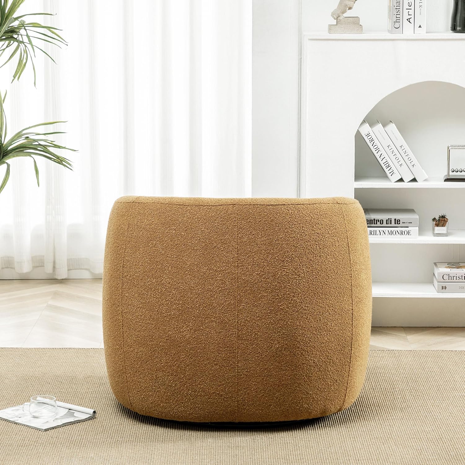 - BOUCLE UPHOLSTERY—This large Mid-Century Modern Swivel Barrel Chair is crafted with luxurious, popular boucle upholstery. It provides a cozy, soft seating experience that instantly elevates your relaxation and comfort, especially on cold days or when you are alone, bringing you the warmth of spring