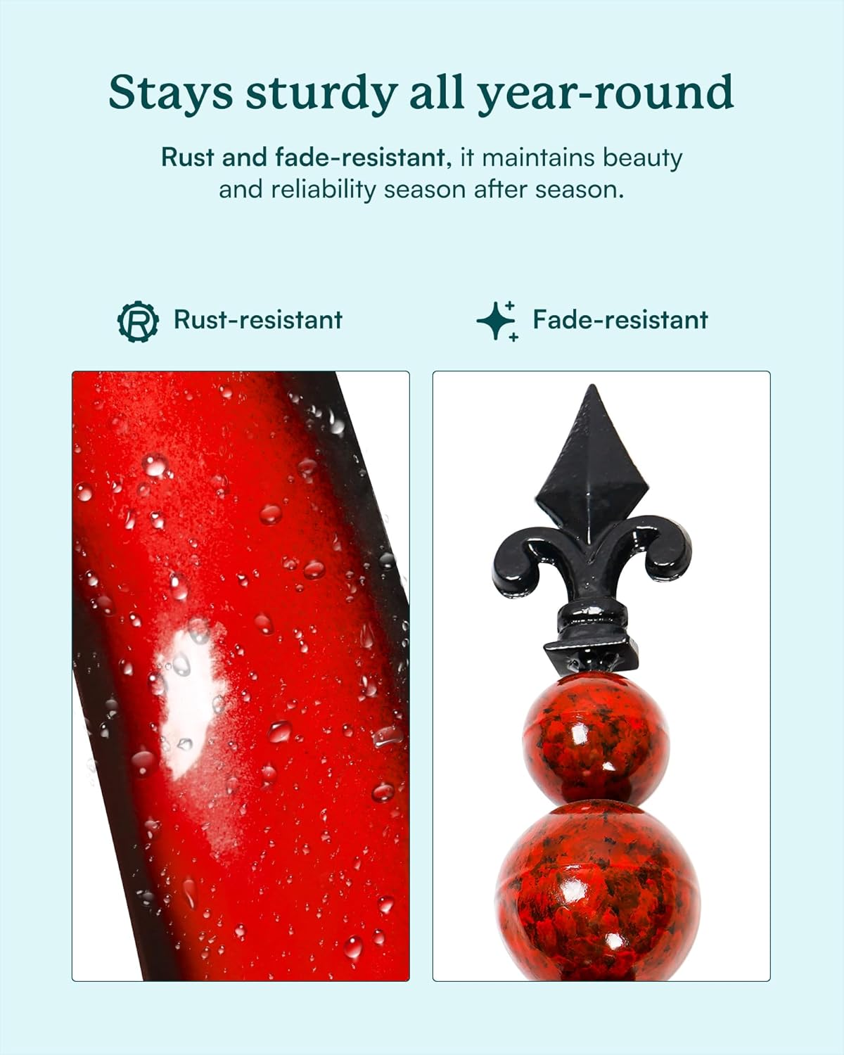 - RESISTANT OUTDOOR METAL DECOR: Made of resistant metal with protective coating finishes. UV, RUST, and FADE RESISTANT. The all-season decorative spinner can be cleaned easily to keep its reflective shine and rustic appearance. Long-lasting use