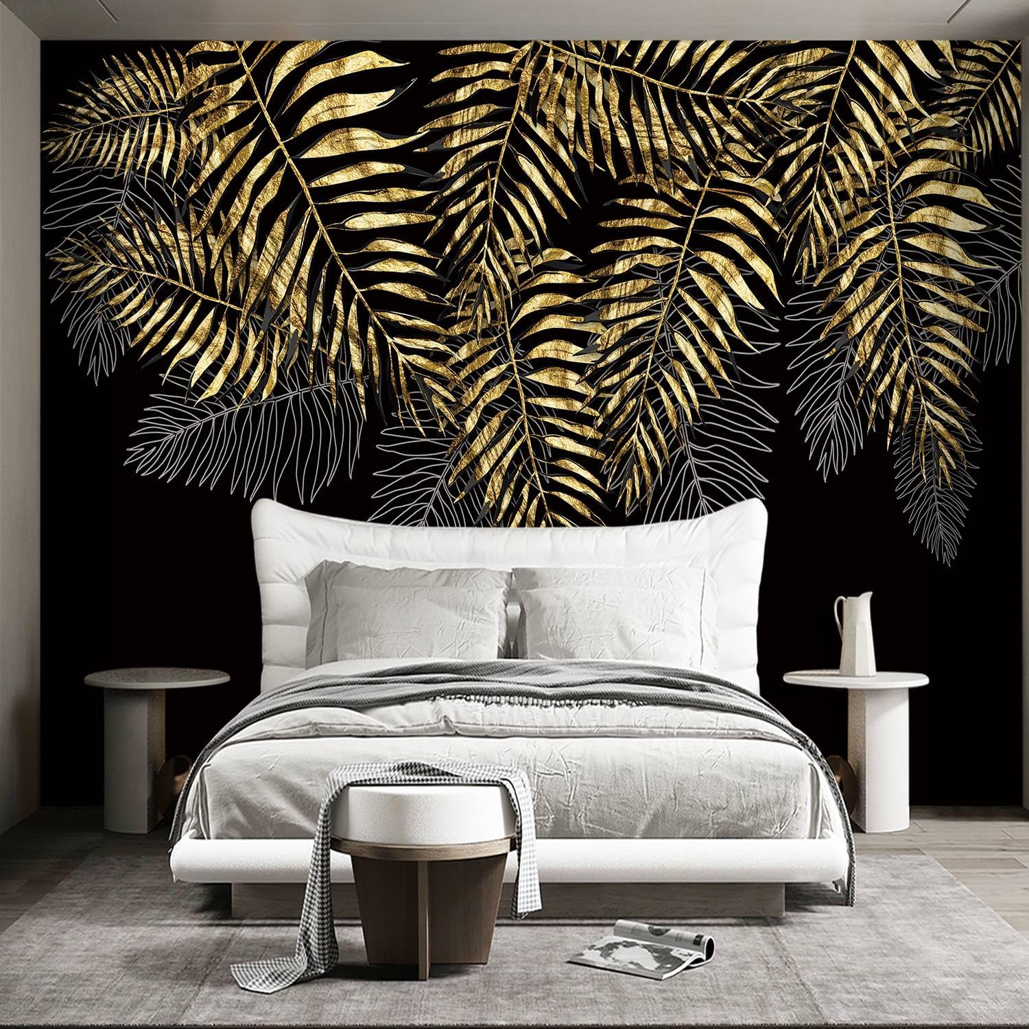 Black and Gold Leaf Mural Bedroom Tropical Botanical Wallpaper Room Plant Decor Living Room tv Background Large Wall Mural - 137"x96" (Not Peel and Stick)