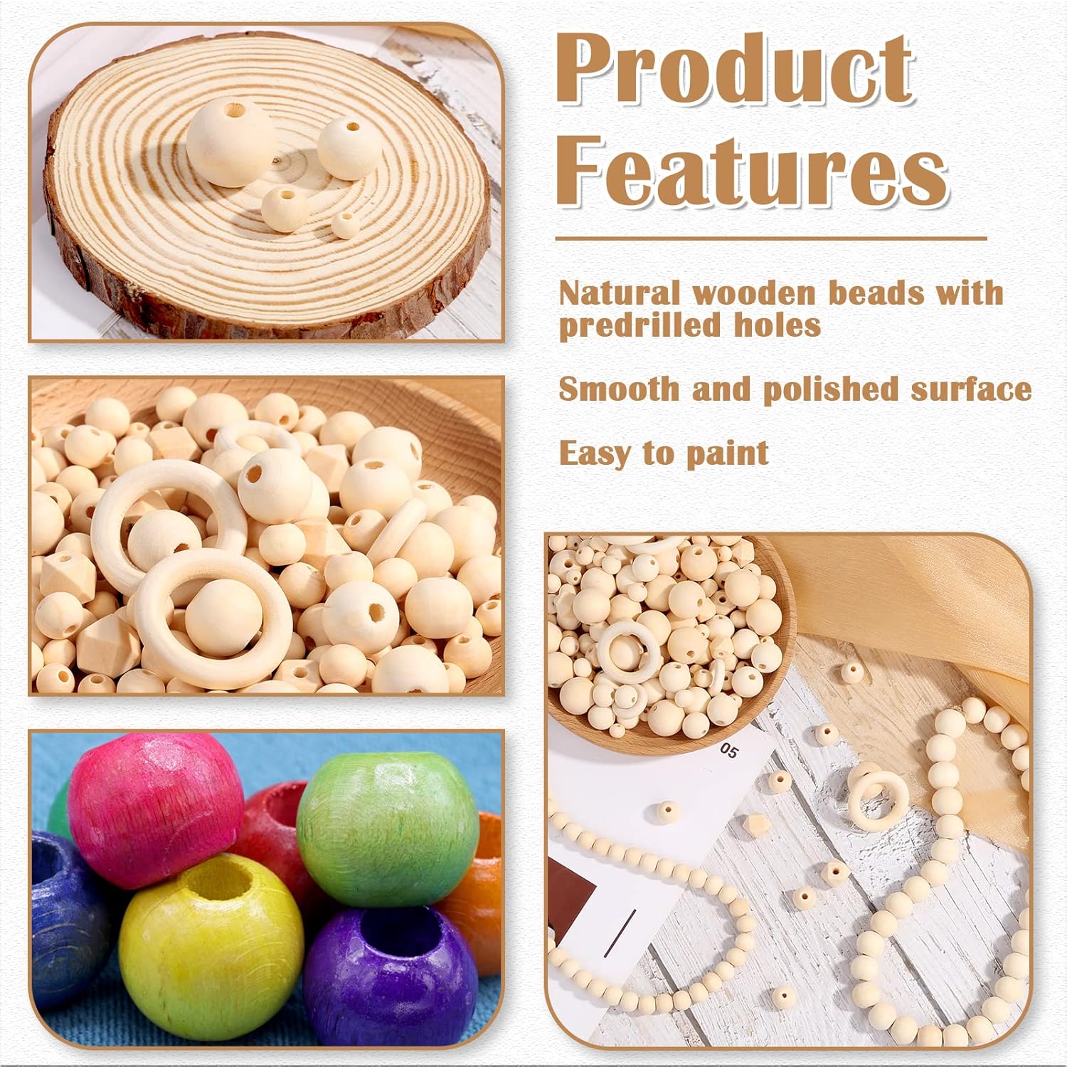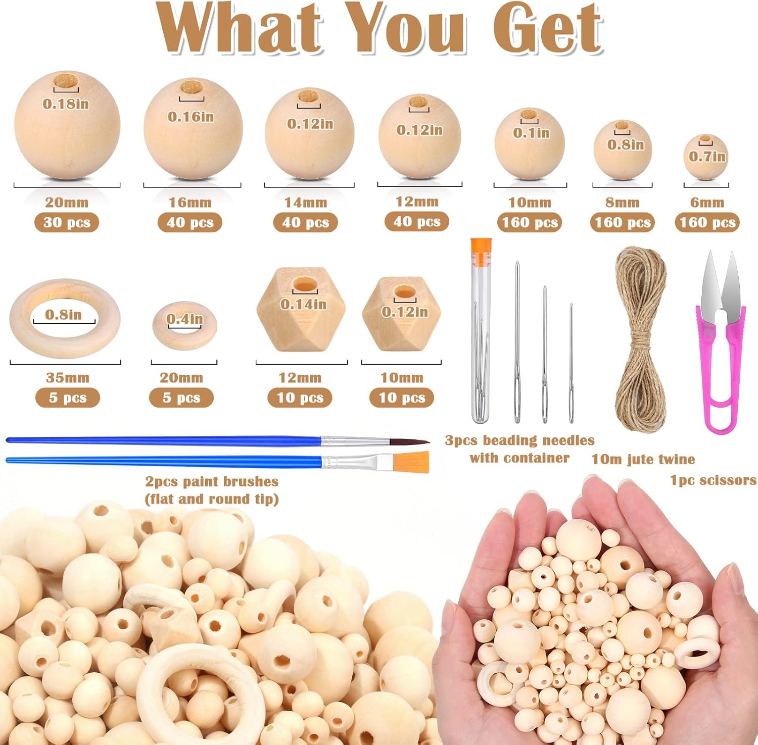 - [Abundant Wooden Beads Rings for Crafts] You will receive 660 pcs unfinished wood rings beads for crafts with holes in various sizes (20mm 16mm 14mm 12mm 10mm 8mm 6mm wooden beads and 35mm 20mm wood rings), enough for your daily use and replacement. The classic beads match with a variety of crafts projects. Moreover, they also comes with twine, beading needles, and scissors which are convenient for your DIY crafting, you can mix these large wood beads up as you like to add more whimsy.
