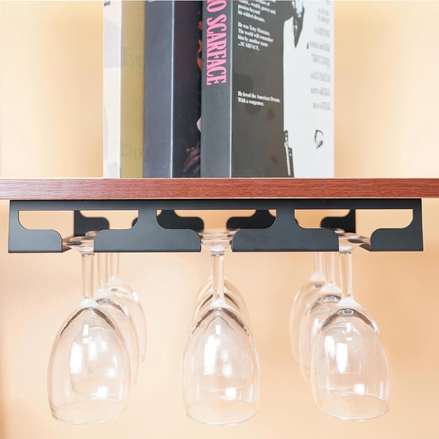 - Space Saver: Helps you tidy up your kitchen, cabinets or bar. Install extra space under cabinets to store wine glasses.