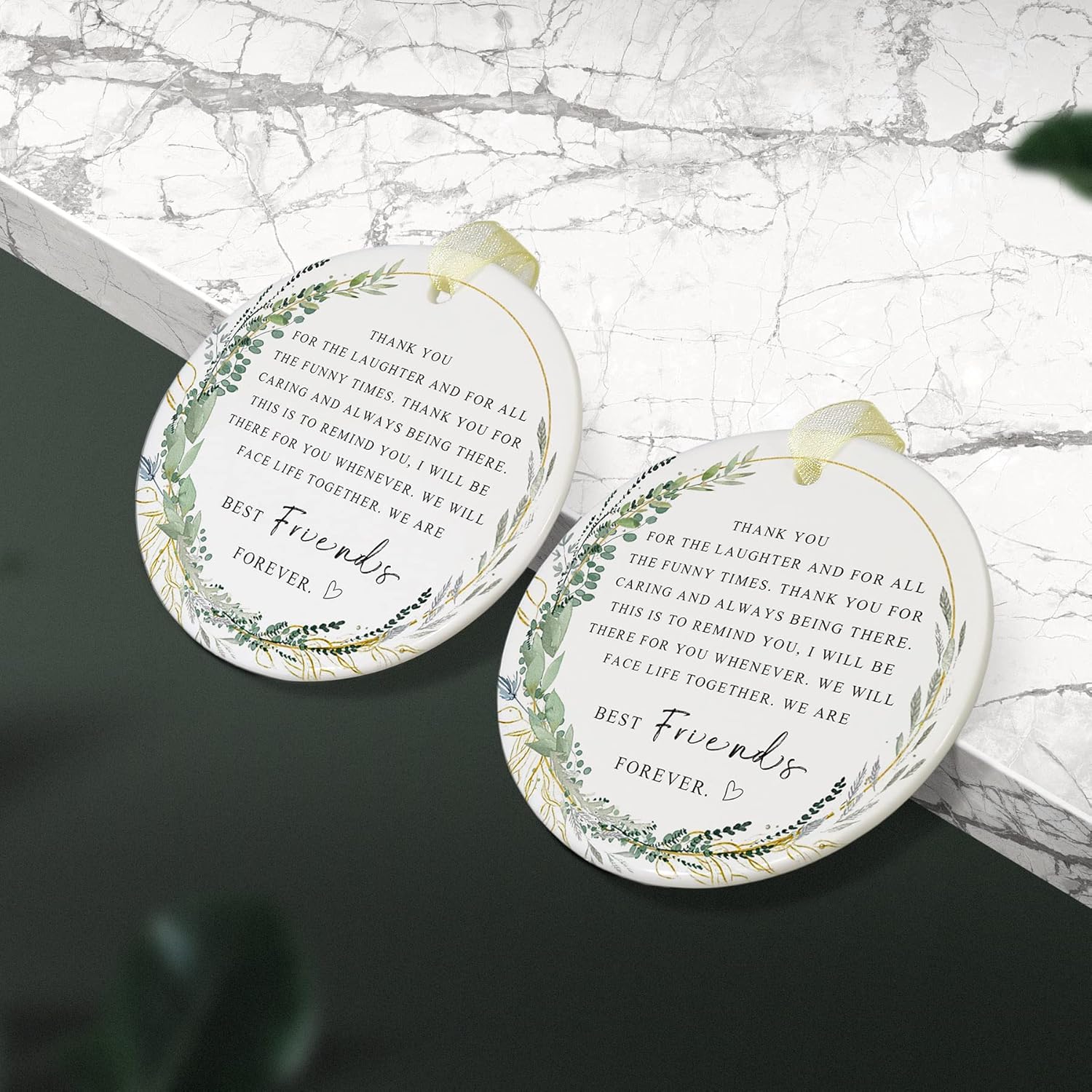 - 🌼【Perfect and delicate size】This is a friend memory ornament with a diameter of 2.9 inches and a thickness of only 0.18 inches. The product includes: a round friend ornamentt*1, a gift box*1 and a lanyard*1. The gift box comes with it makes it easy for you to give the best friend ever gifts directly to family and friends and other special people in your life, and the lanyard that comes with it helps to hang it easily on the Christmas tree or anywhere you want.