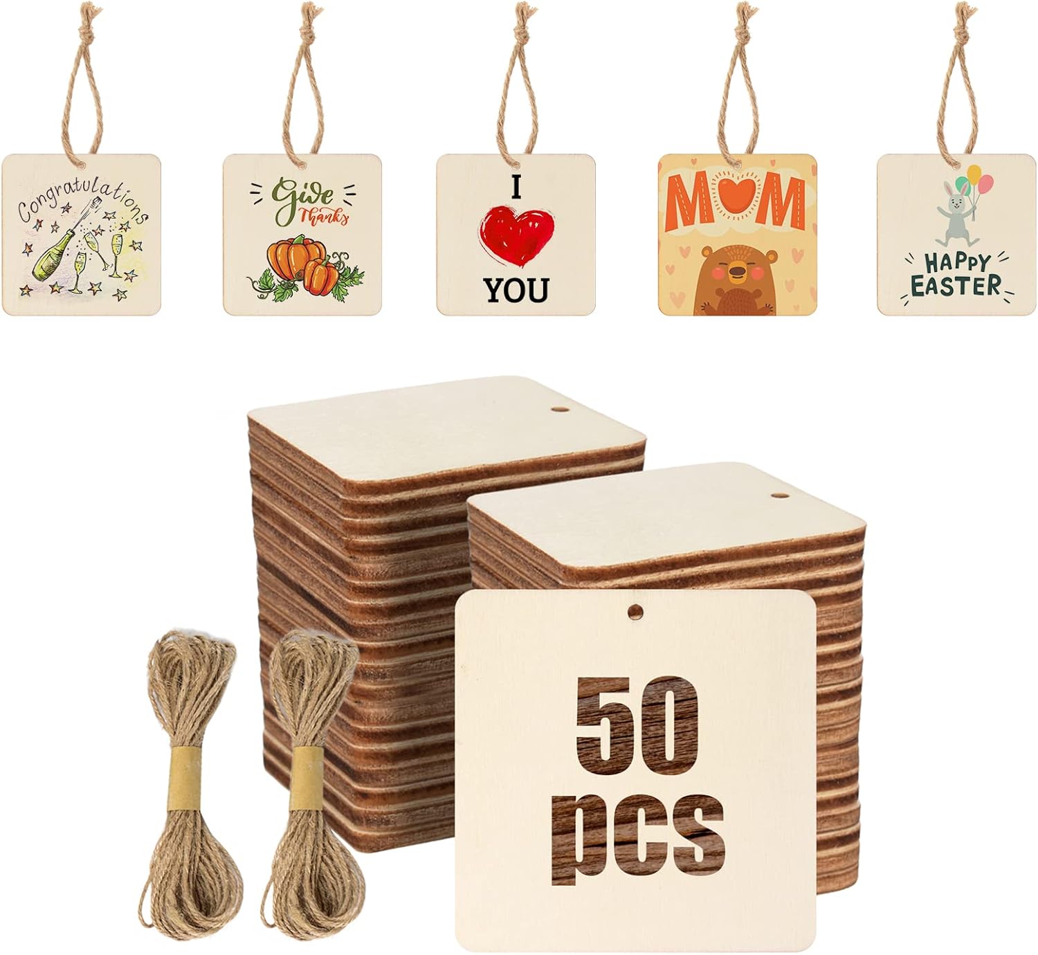 - PACKAGE: Each set contains 50 pieces of 3 x 3 inch unfinished square wood tags, 2 pieces of jute twines, which can be made into various styles to meet your various needs