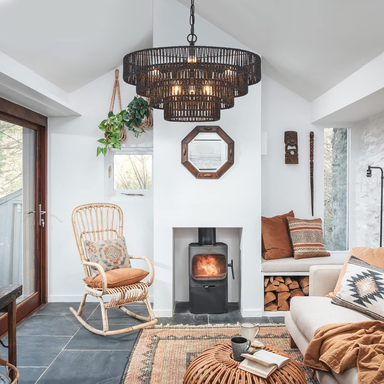 - Eye-Catching Design: This woven rattan chandelier is made of wicker woven with high-quality 4 round metal frames finished by matte black, forming a semicircular hollow cage, combining boho, modern, chic feelings to your home.