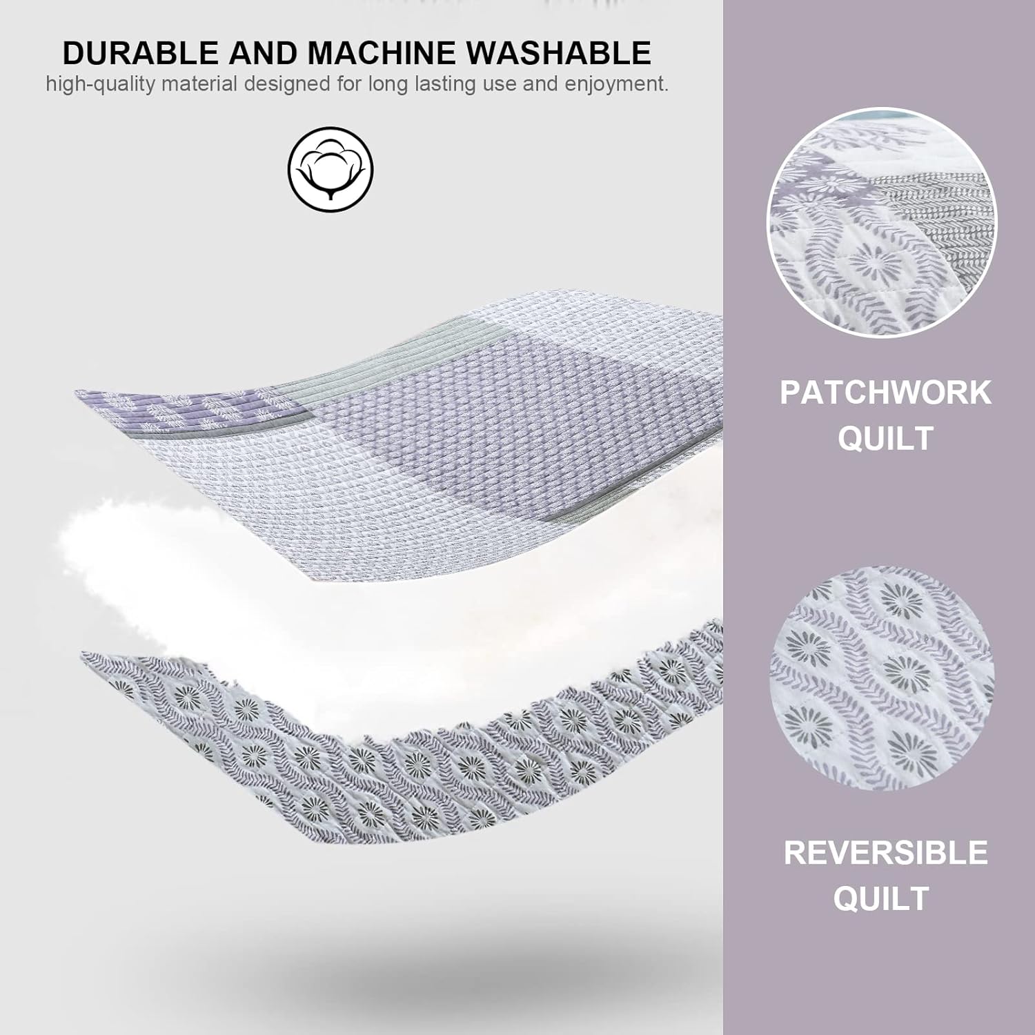 PANGUSHAN Quilt Set King Size, 100% Cotton Bedspread Quilt Bedding Set, Patchwork Reversible Floral Quilt for King Bed, Purple/Grey/White Bed Spread, Lightweight Comforter for All Season, 3 Pieces