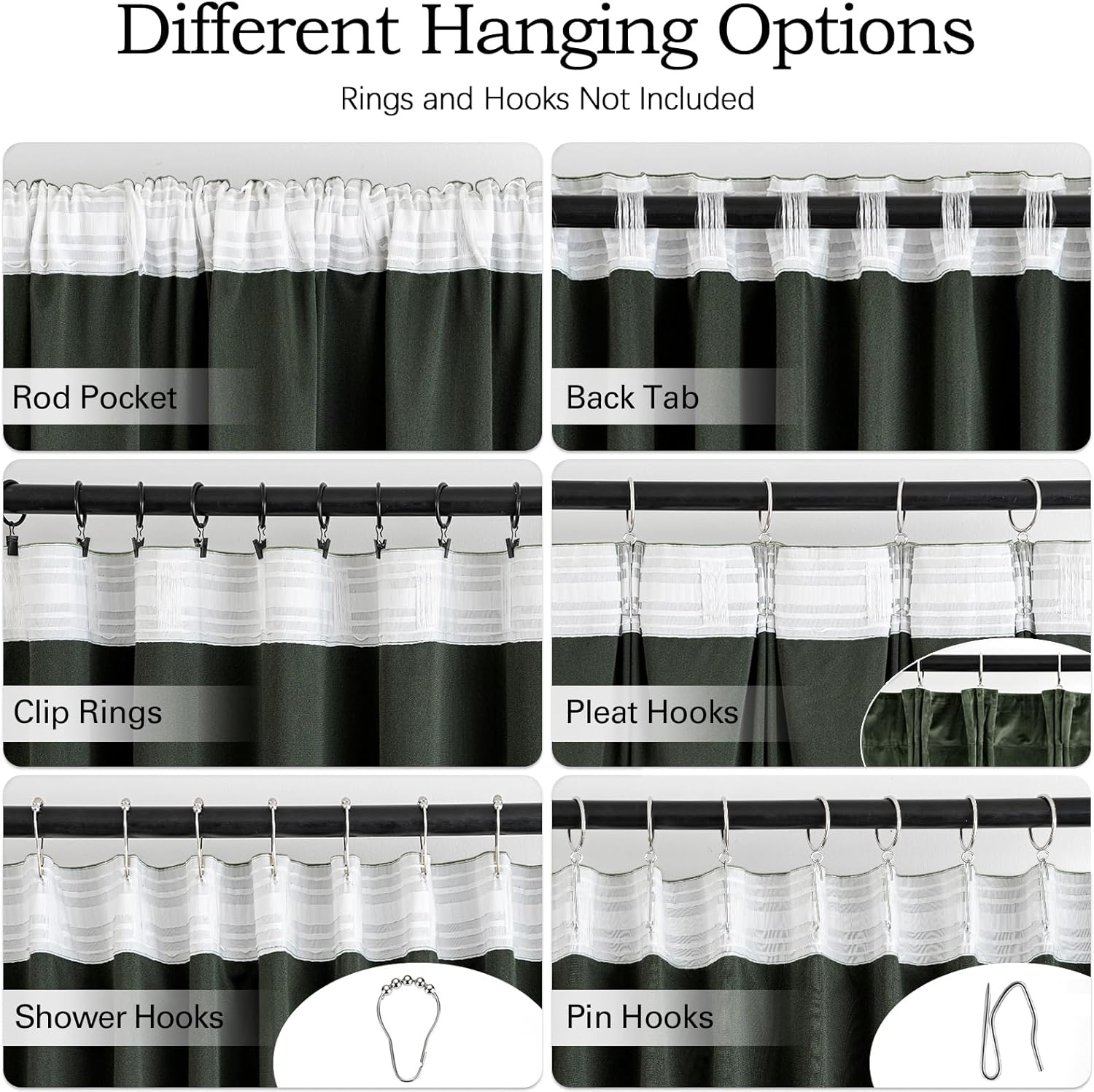 - HANGING OPTIONS: Each curtain panel has 3-in-1 top style design: rod pocket, back tab and pinch pleat. Back loop (2.3 inch) and rod pocket (3.1 inch) fit most standard rod. Curtains also can be hung with clip rings or curtain hooks. 3 ways to meet your various needs.