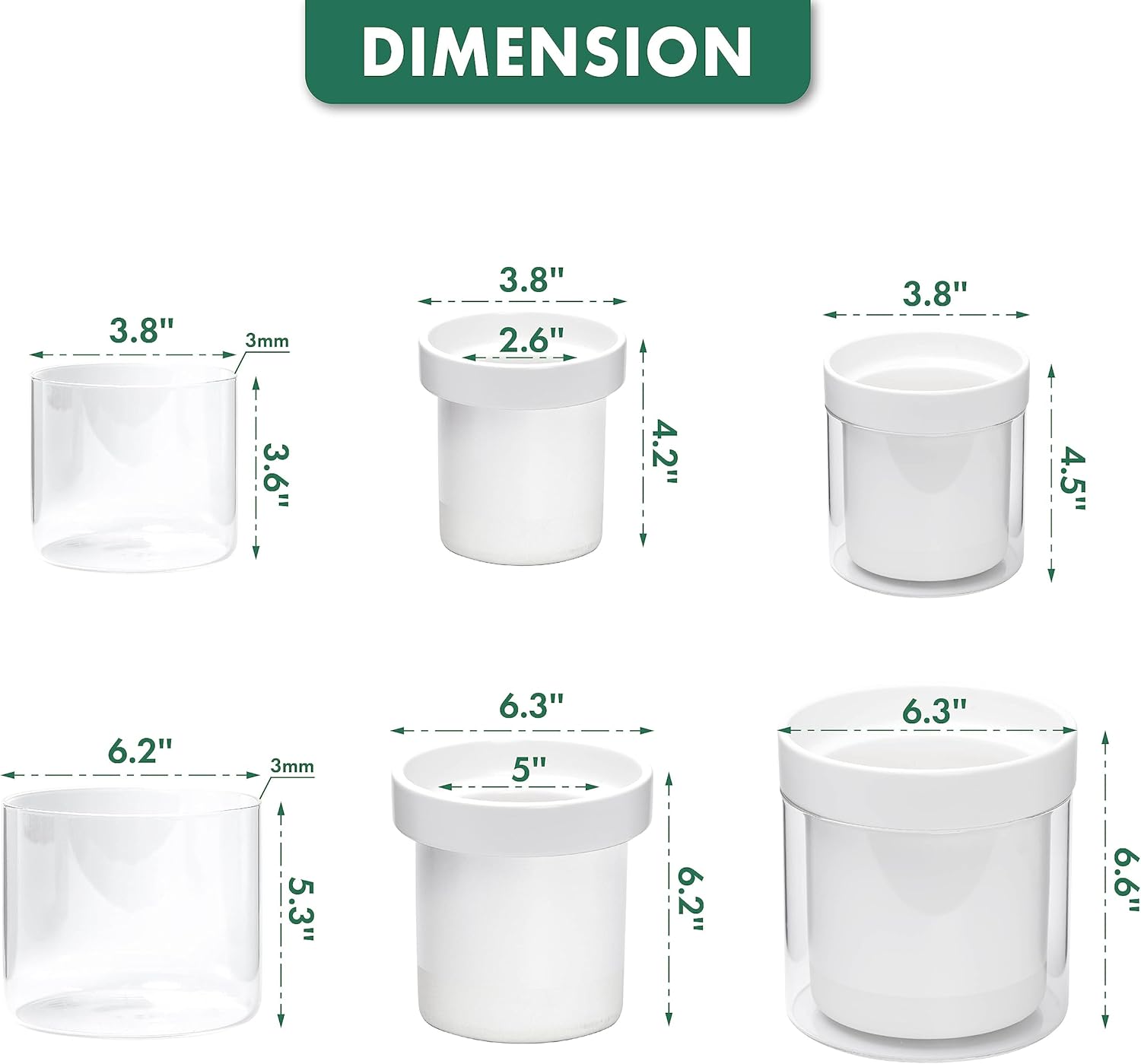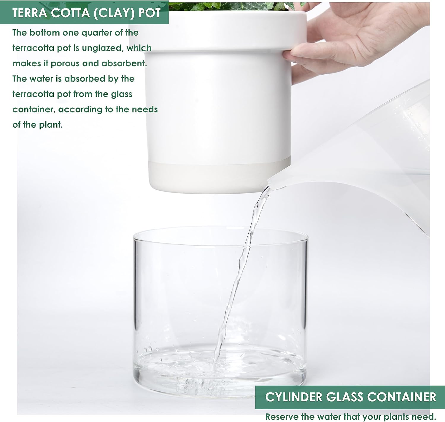 Phoenix Vine 6 Inch 4 Inch Self Watering Planter, White Terracotta Clay Pots with Glass Reservoir for Indoor Plants, Herbs, Flowers, 52-B-G-46