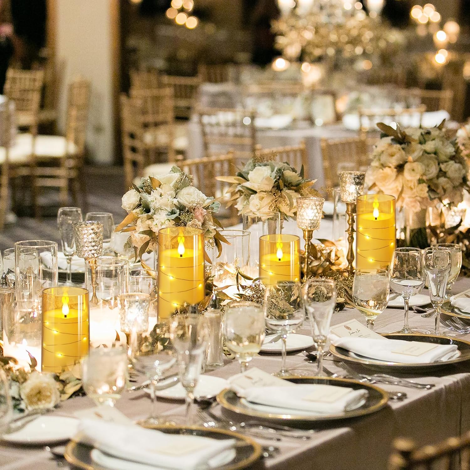 NURADA Flickering Flameless Candles: Built-in Star String Lights Acrylic Battery Operated LED Pillar Candles with Remote and Timer for Romantic Mood Home Decoration - 3 Pack Gold