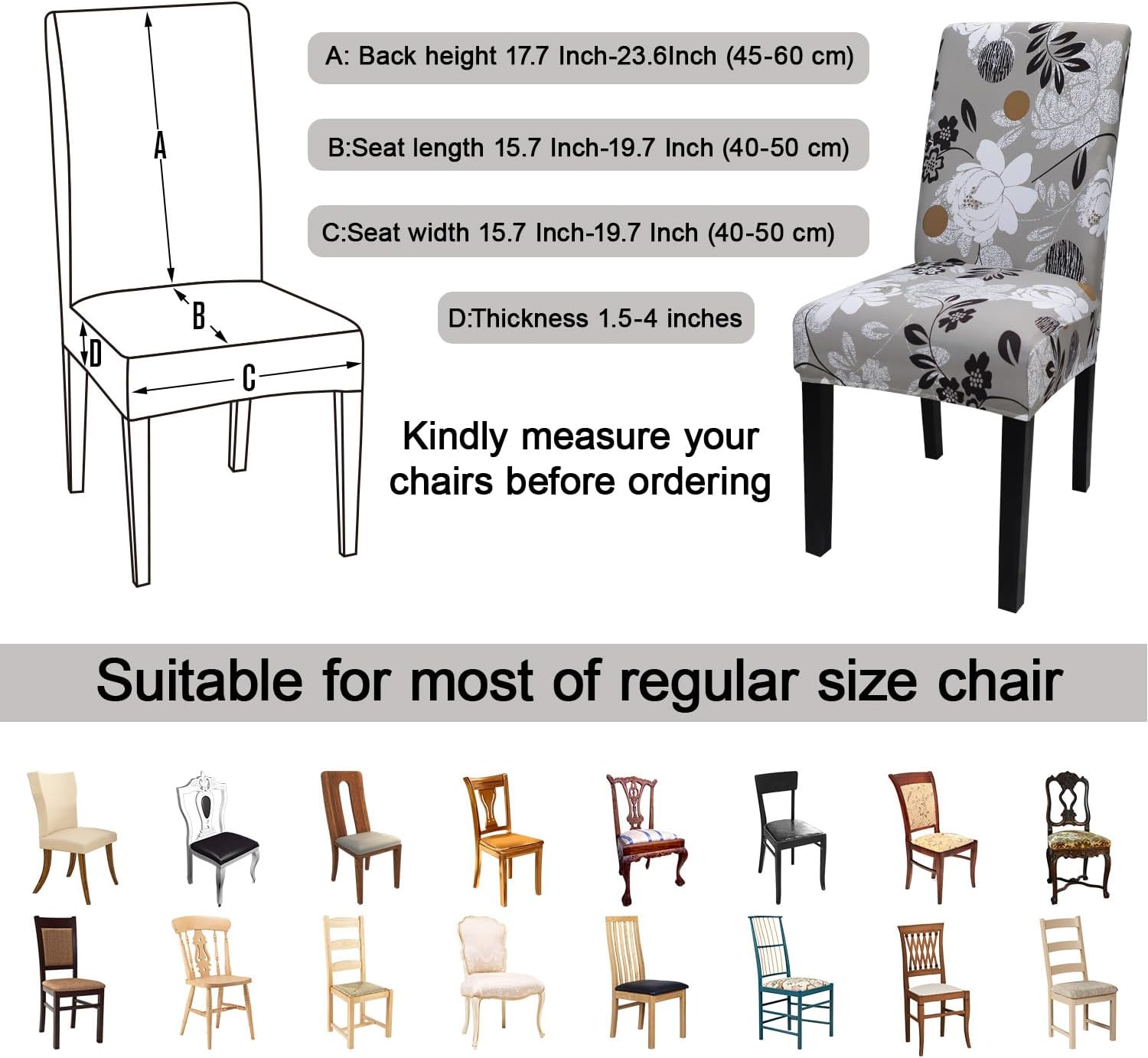 - 【Suitable for Chair Size】- Chair back height 17.7 Inch-23.6Inch (45-60 cm), chair-back width 15.7 Inch-19.7 Inch (40-50 cm),Inch Chair seat length and width 15.7 Inch-19.7 Inch (40-50 cm).Thickness 1.5-4.5Inch (4-12 cm). Please check the measurement guide in the item picture before order..(Please allow 0.5-1 inch error due to manual measurement.)