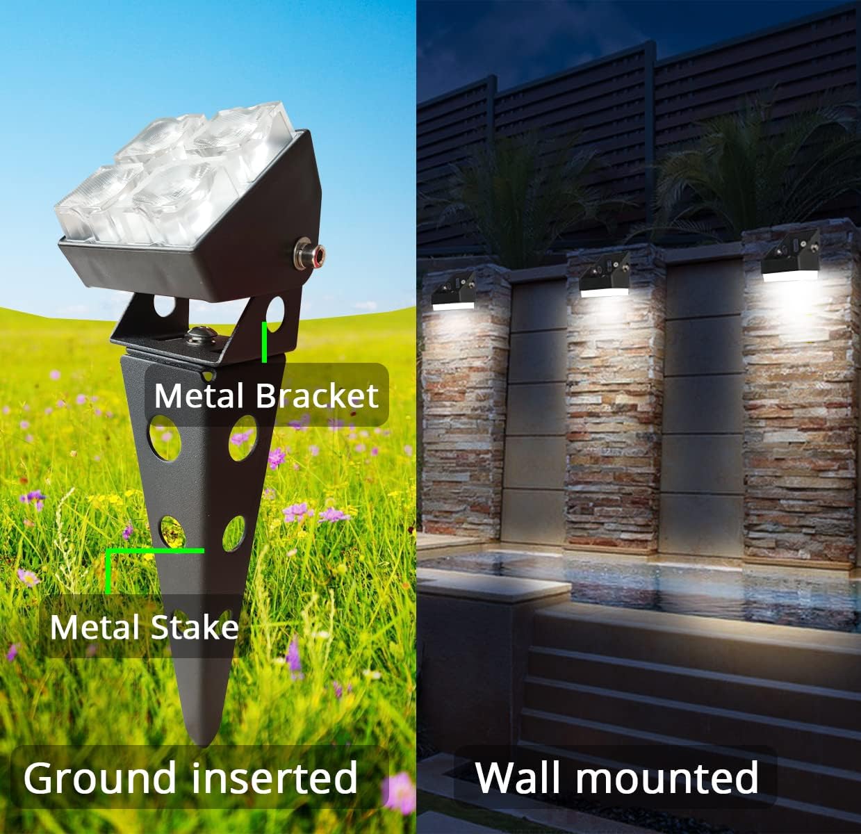 - 【IP65 Waterproof & Easy Installation】The Solar Outdoor Light head is sealed by silicon glue, completely waterproof for outdoor use, stick into the ground with the metal stake as landscape lights, or mount on the wall with the screws as wall lights, optimum for Patio, Porch, Path, Deck, swimming, pool, Yard, Garden, Garage, Driveway, Pathway, etc landscape lighting.