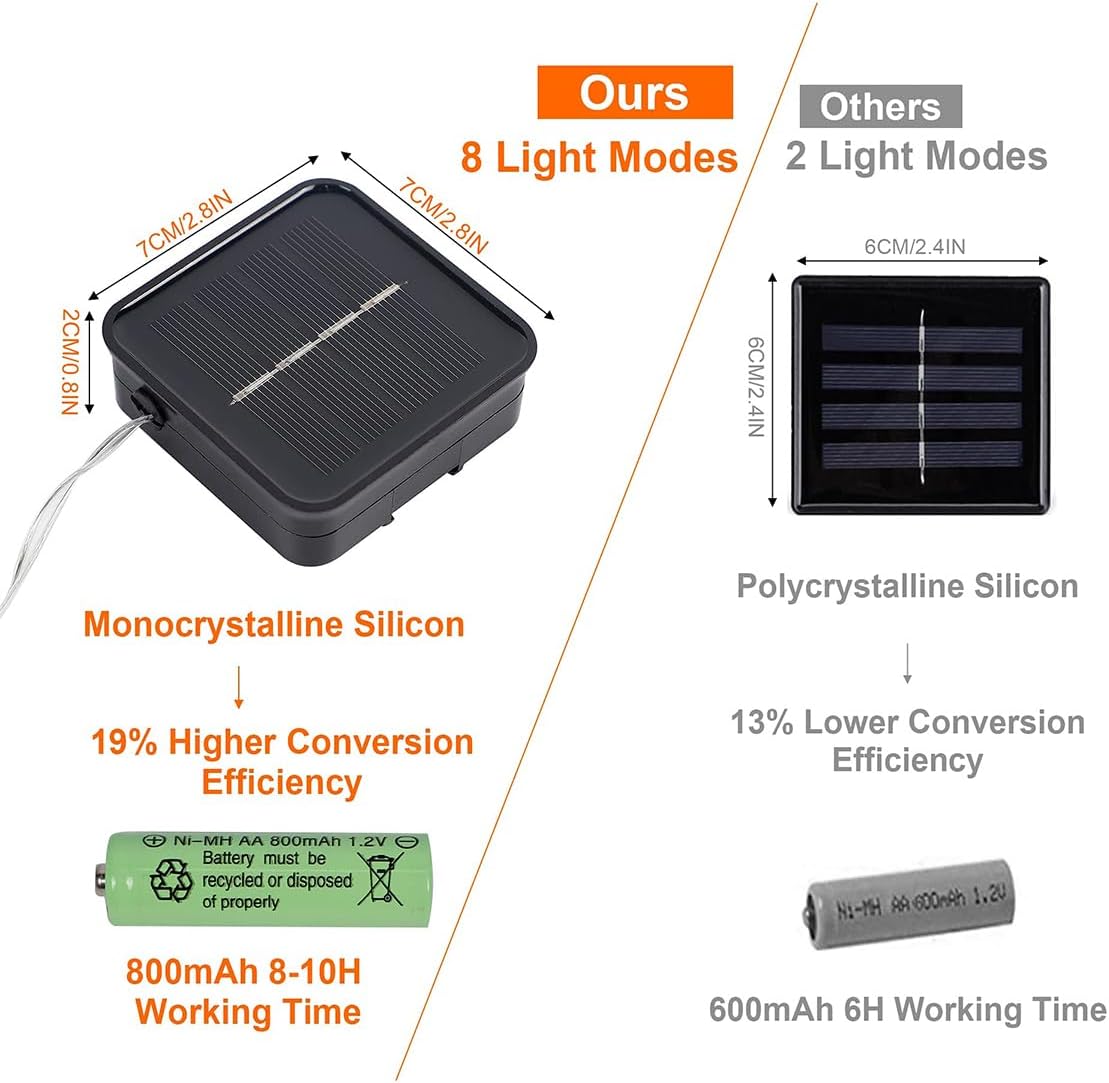 - 8 Lighting Modes with Memory Function: Our solar string lights have 8 lighting modes for you to choose: combination, in waves, sequential, slo glo, chasing/flash, slow fade, twinkle/flash, and steady on. Comes with memory function, remember last setting automatically after turn off the power, no need to reset again.