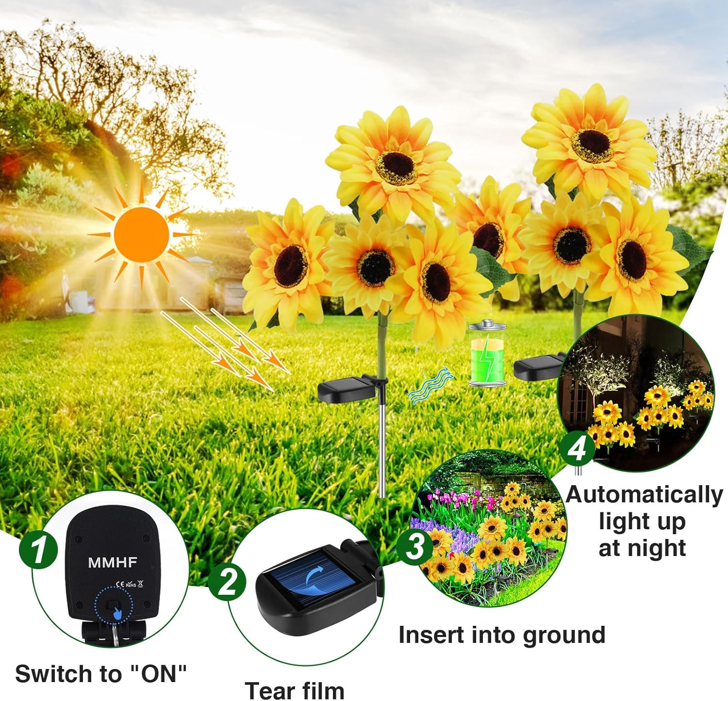 - 【Brightness & Beautiful】3 in 1 solar decorative sunflower light, 24 LED bulbs will turn on automatically at night! MMHF solar sunflower lights outdoor is beautiful enough to create a romantic atmosphere. Make your garden unique!