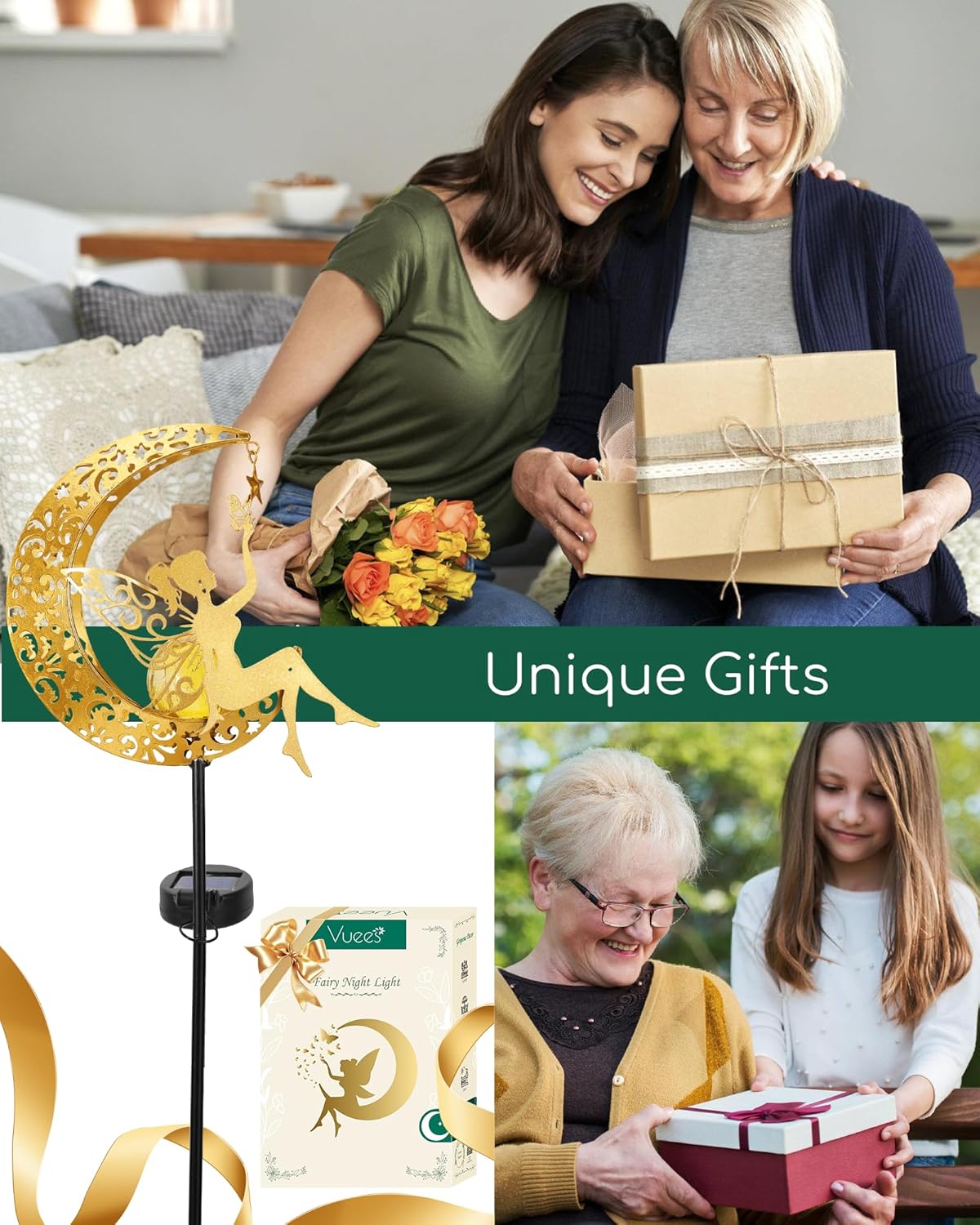 - WHAT'S INCLUDED: You will receive a solar fairy garden light stake, a user manual, and a packing box. We offer a worry-free 18-month warranty and provide friendly customer service with a 24-hour response time. Upon receiving the fairy solar lights, please press the ON button and keep the solar panel in darkness to test if the lights illuminate. Christams decoration gifts for mom, grandma and family.