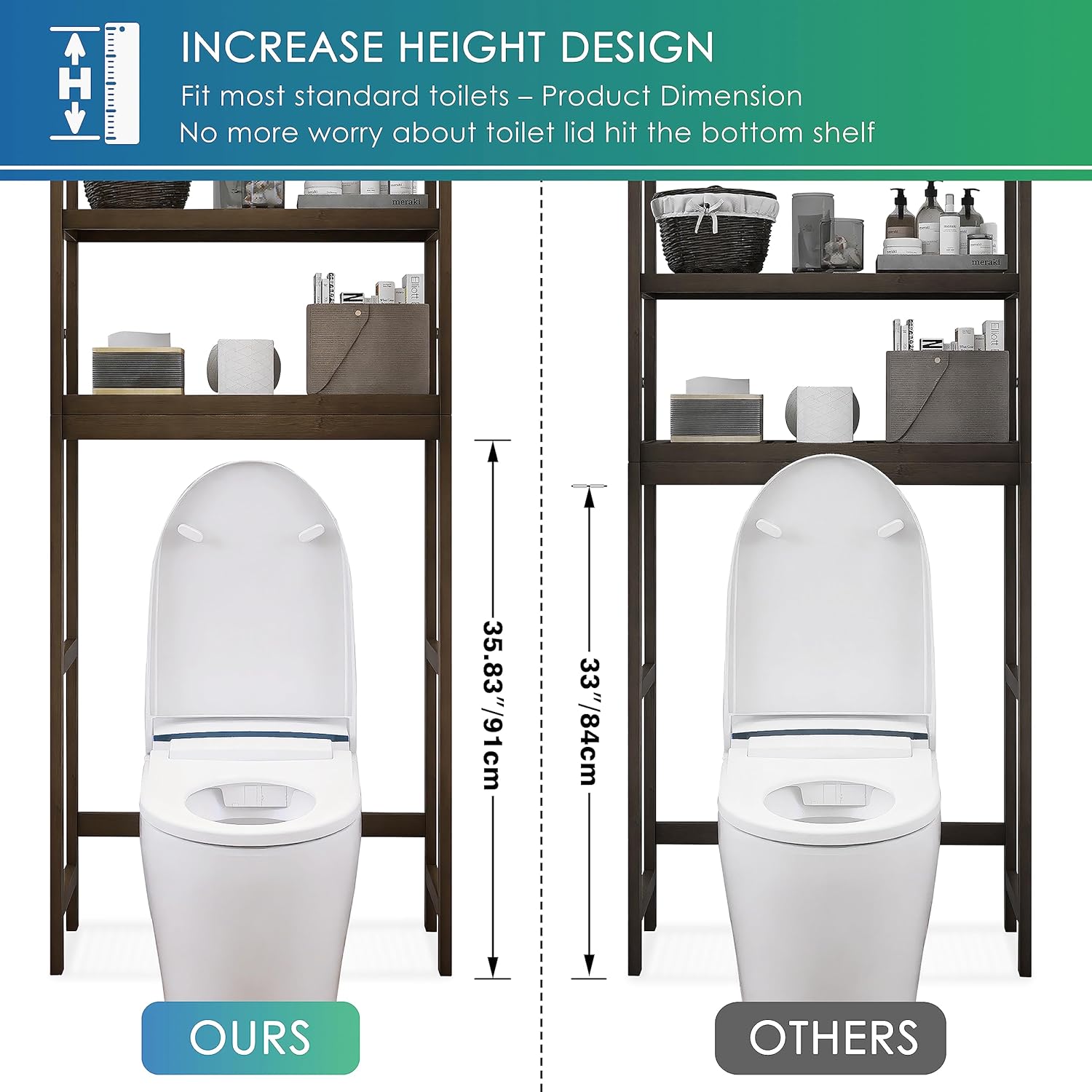 - FIT MOST STANDARD TOILETS: Product dimension: 24.8”L X 10.2”W X 67”H (63x26x170cm). The toilet clearance of this Multipurpose storage organizer is 37.42” (95cm) from ground, suit for most standard size of toilets, perfect use in bath, laundry room, balcony