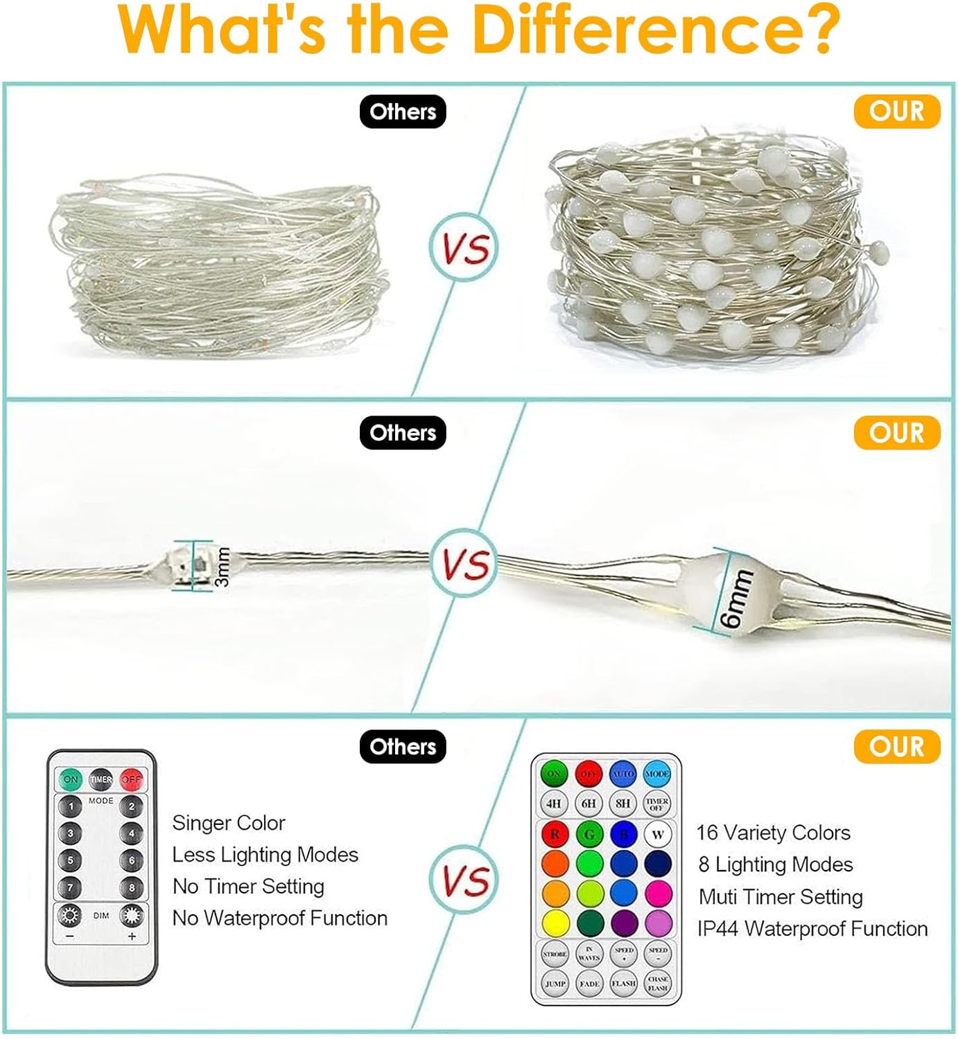 - Fairy Lights with Remote Control and Timer: You can use the remote control to get multiple lighting modes. The built-in timer IC eliminates the need for manual power on/off daily, automatically activating at a preset time each day, freeing you from this task