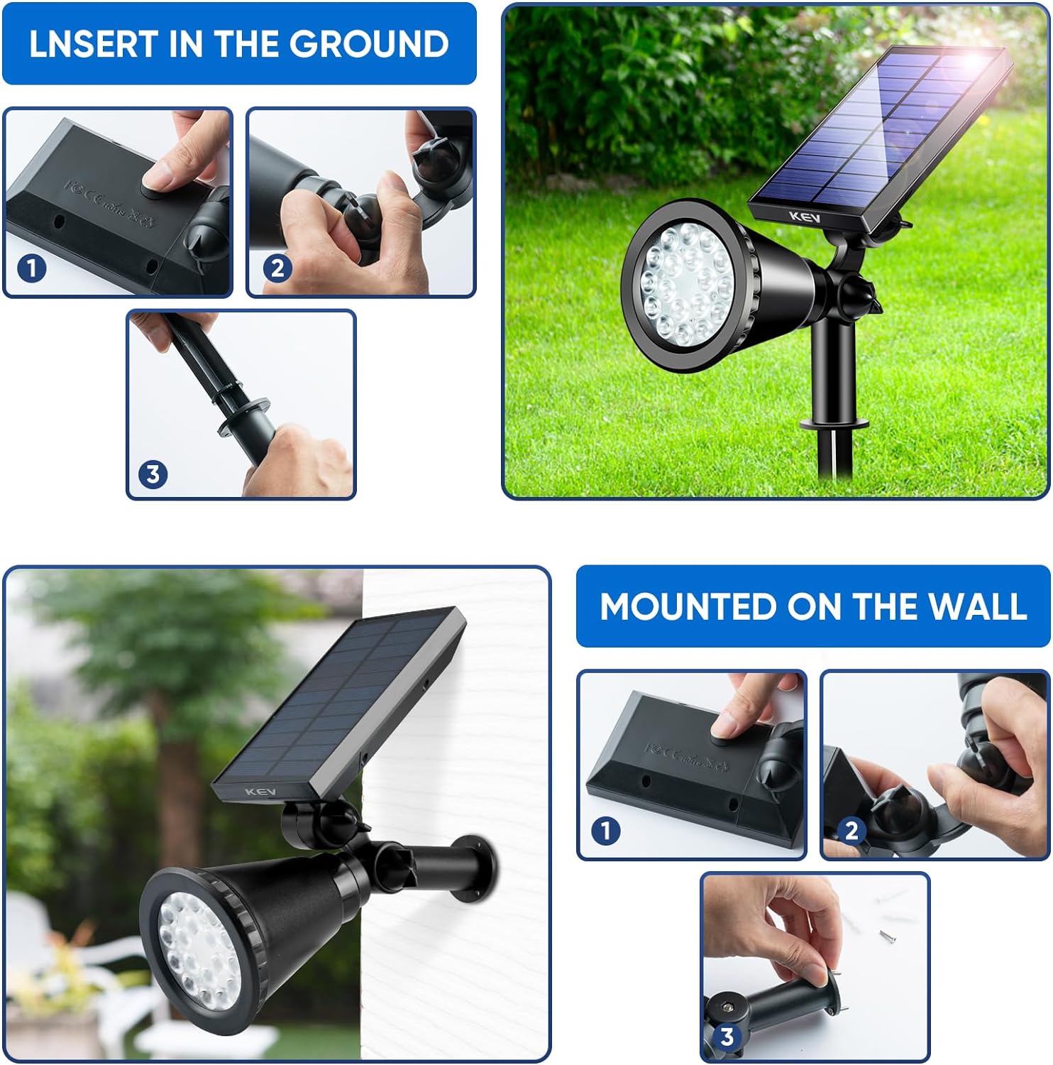 - 【Super Bright &2 Lighting Modes】Equipped with a wide solar panel,KEV 18 LED solar spot lights can provide up to 800 Lumens to light up your entire yard.Solar light has 2 lighting modes: High Mode /Low Mode,the upgraded large capacity 2200mAh battrey allows it can work continuously for 6-10 hours.