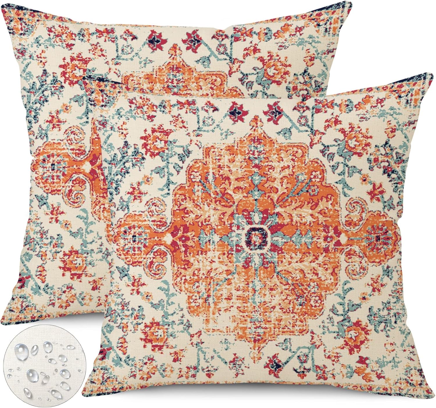 Outdoor Waterproof Pillow Covers - 20x20 Inch Set of 2 Bohemian Vintage Carpet Pattern Pillow Covers in Orange and Blue Ethnic Design for Decorative Farmhouse, Couch, Garden, Balcony