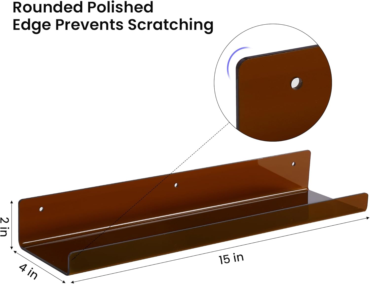 upsimples Acrylic Shelves for Wall Decor, 15" Display Shelf Perfume Organizer for Bathroom, Bedroom, Living Room, Floating Bookshelves for Kids, Clear Brown, 4 Pack