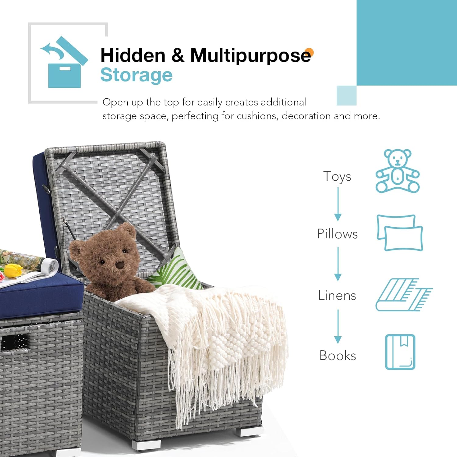 - [Hidden Storage & Fixed Rope Design]: The on-trend colors and weave make this a stand-alone piece if you're looking for an alternative to traditional storage options. Just open the top of the footrests to find the hidden storage space, solving the problem of having nowhere to store the items you need, such as cushions, toys, snacks, tools, and more insides for your convenience. The fixed rope design can fix the top better and provide support.