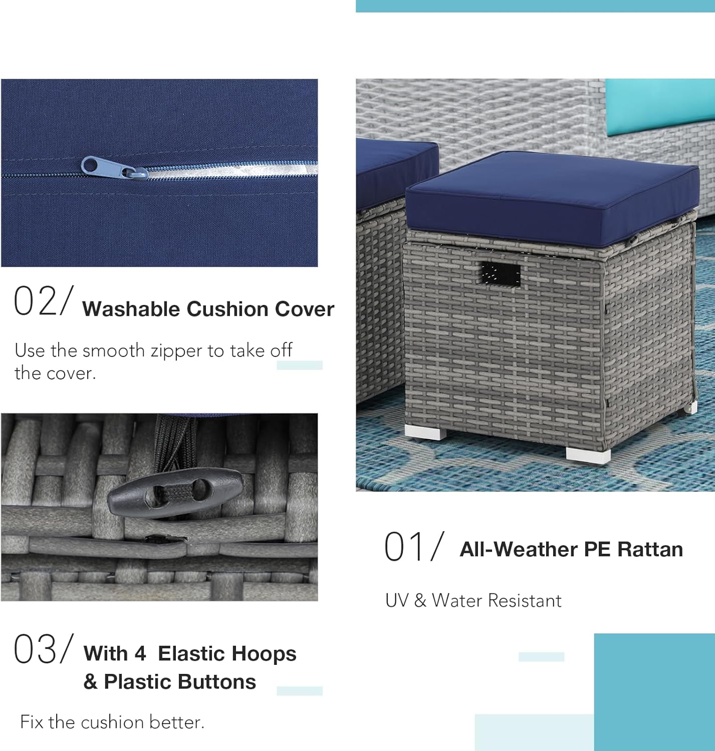 - [Ultra-comfortable Cushions]: Each ottoman is equipped with a 3-inch cushion for optimal comfort, High-density fillings make the ottoman much softer to sit on, and the smooth zippers make it easy to remove and wash the cushion cover. The 4 elastic hoops and plastic buttons prevent the cushion from moving. (Note: Cushions are non-waterproof.)