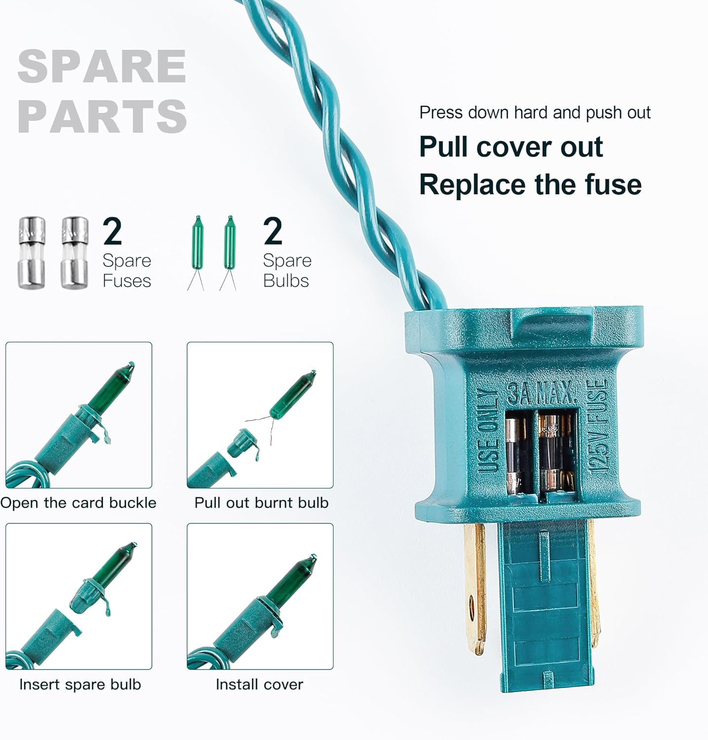 - 🌲Safe to Use : 50count green Christmas string lights are UL certified and the quality is guaranteed. Our Christmas strings lights have built-in fuses, which will protect the short circuit caused by the damaged wire and can effectively prevent the possibility of fire. High quality use rest assured. Warm tips: Please kindly protect these string lights from immersing in water and keep the plug dry.