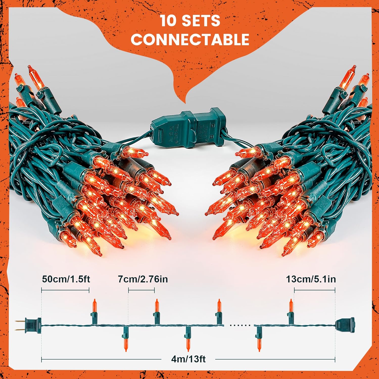 - 🎃Perfect Halloween Lights Decorations:Mimigogo 13ft 50 count orange mini string lights with green wire,which comes with 2 Extra Bulbs and 2 Replacement Fuses. In addition, our wires is more durable compared with other string lights. You can use it for a long time without fear of burning it out.