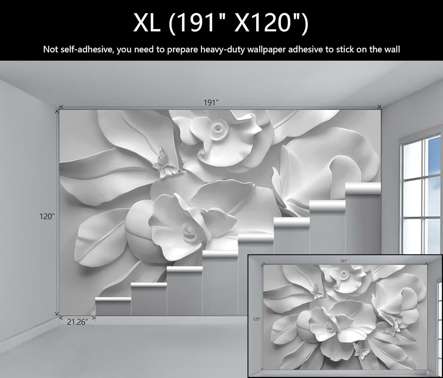- Mural Size: The total size of this mural wallpaper is 191" x 120" / 486CM x 305CM (W x H), cut into 9 pieces, each measuring 21.26" x 120", for easy installation.