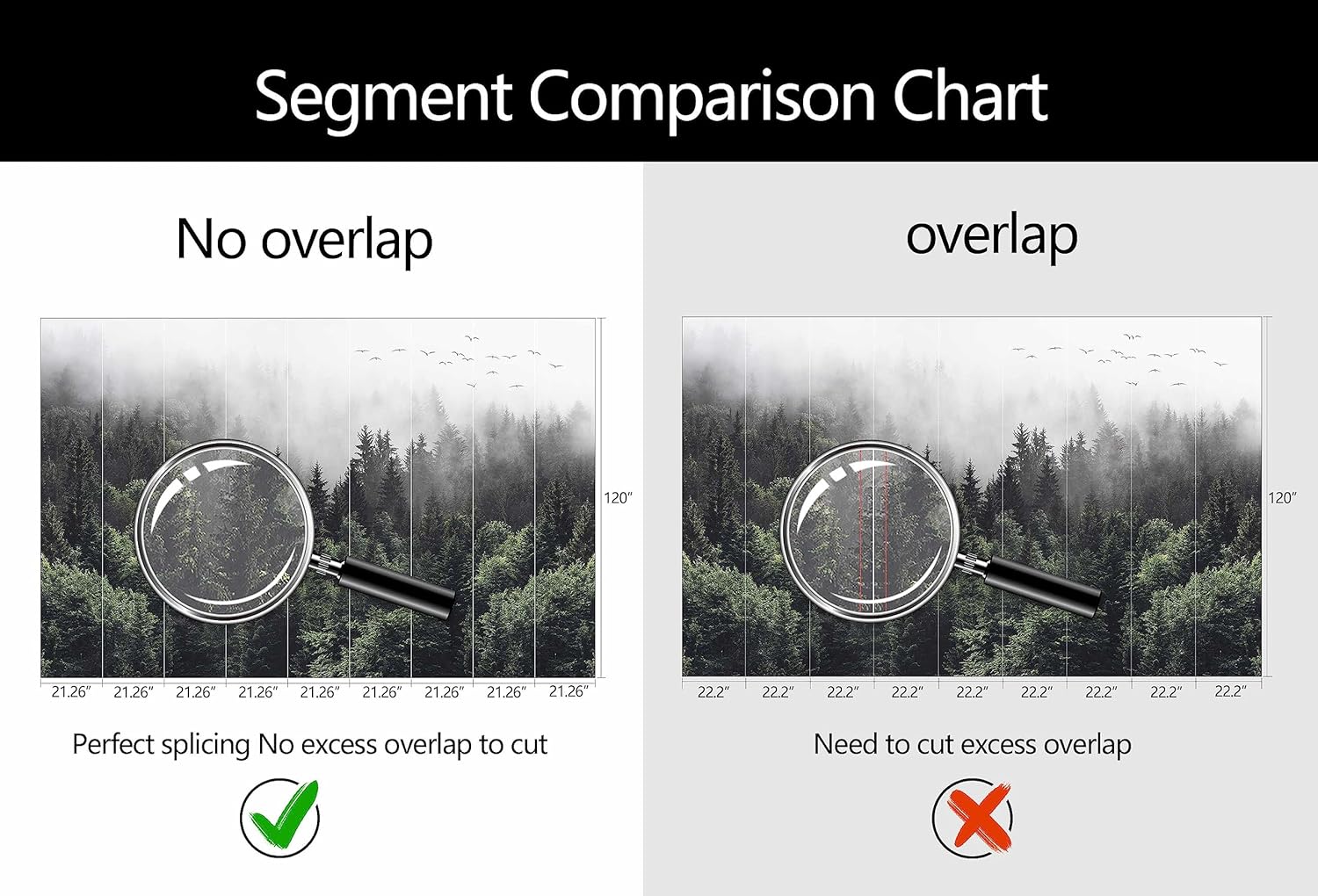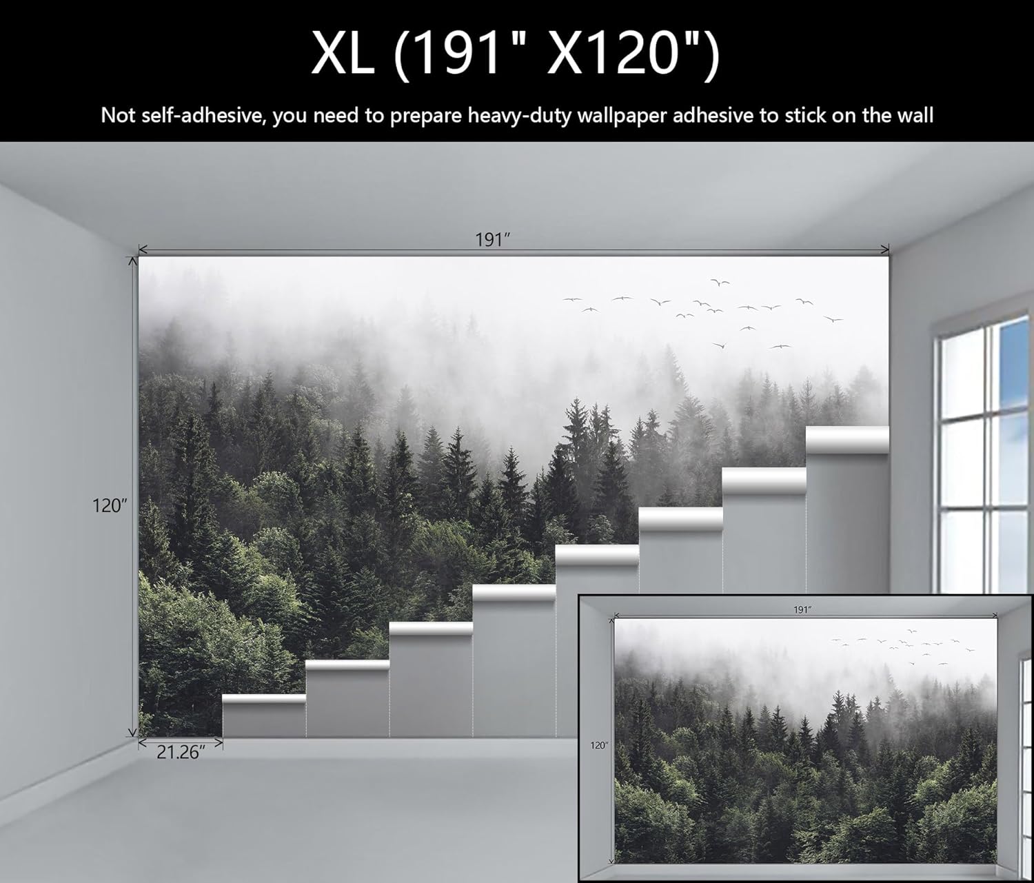- Mural Size: The total size of this mural wallpaper is 191" x 120" / 486CM x 305CM (W x H), cut into 9 pieces, each measuring 21.26" x 120", for easy installation.