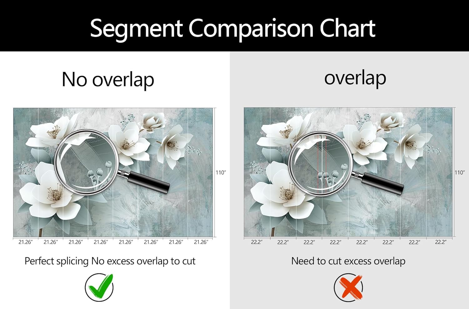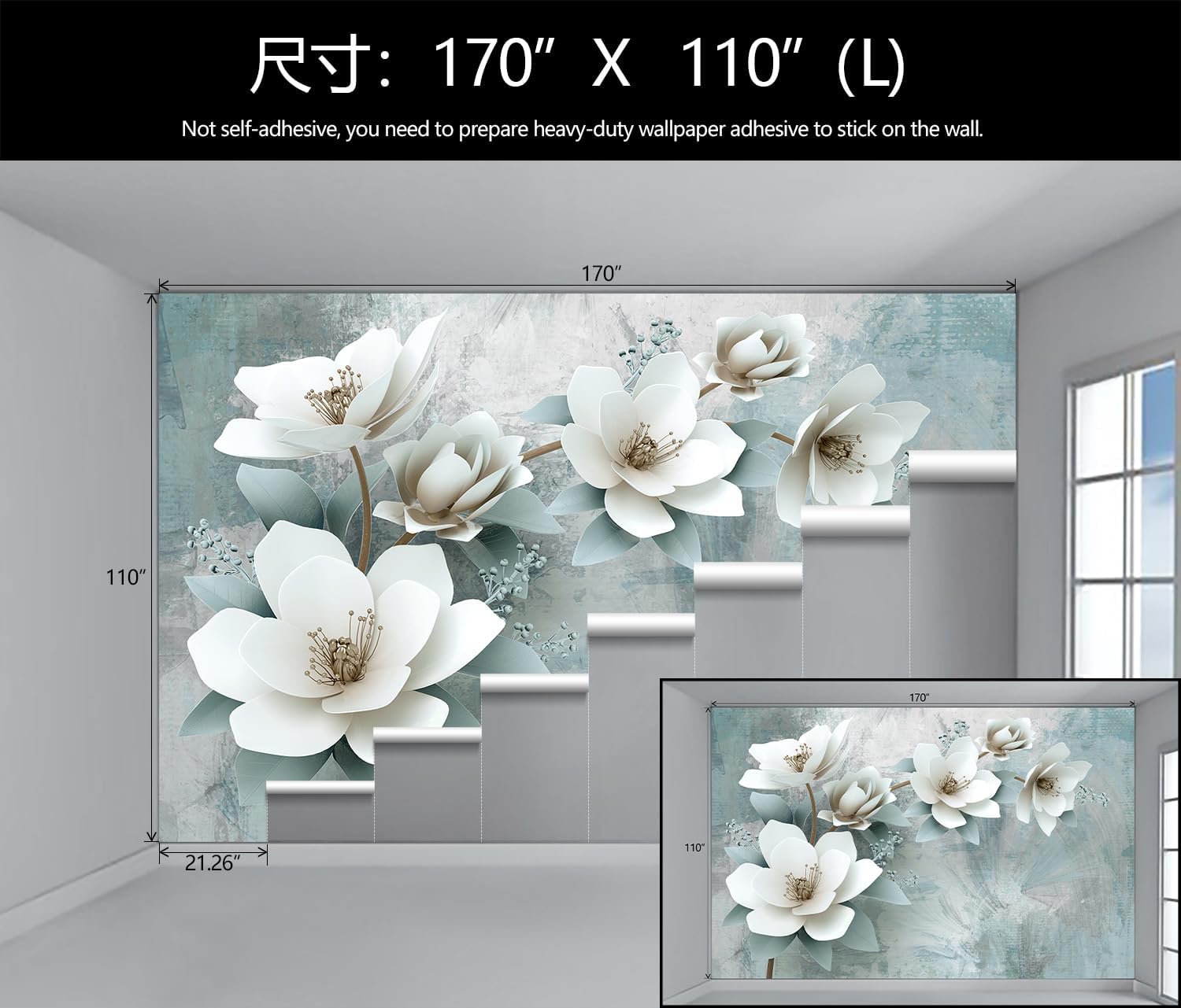 - Mural Size: The total size of this mural wallpaper is 170" x 110" / 432CM x 280CM (W x H), cut into 8 pieces, each measuring 21.26" x 110", for easy installation.