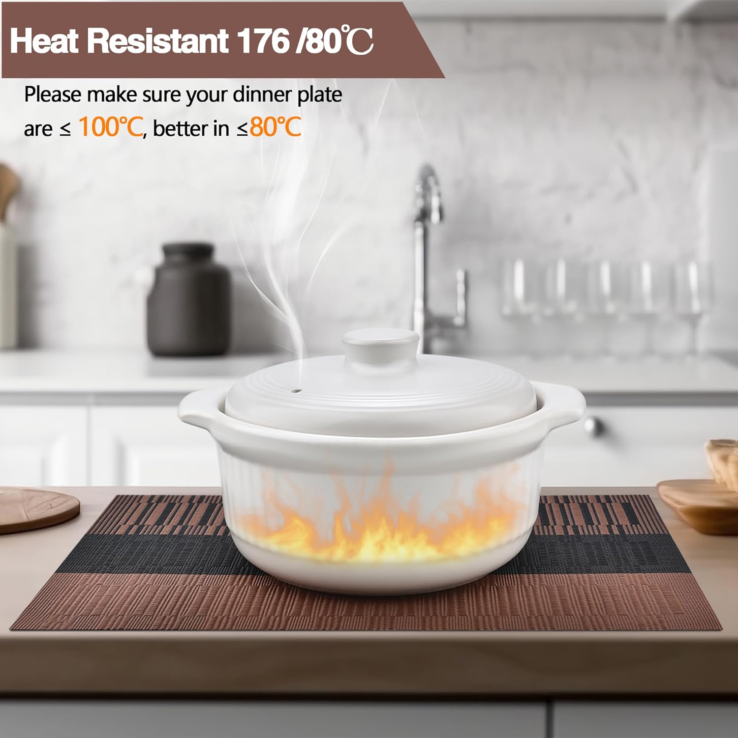 - Heat Resistant: Please make sure your dinner plate are β€ 100β, better in β€80β. It can prevent the table from slipping and scalding the countertop. These beautiful stylish vinyl place mats to add more fun to your dining table