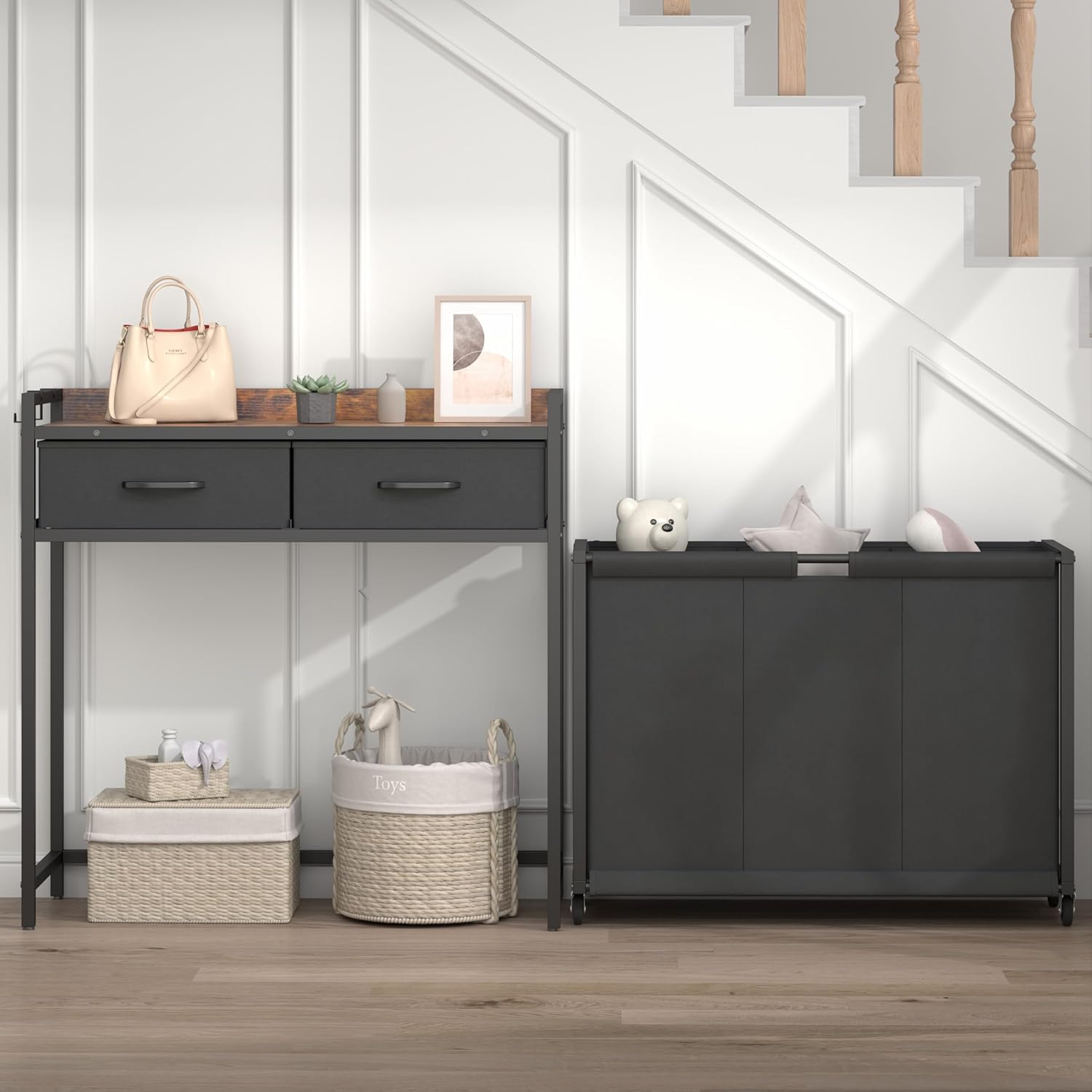 - [Easy Assemble & Reliable Construction] The entire laundry hamper consist of two pieces which are respectively console table with drawers and rolling laundry bags. Both of them utilized powder-coated steel tube as structure, especially the laundry basket choose round tube to reduce wear and tear on fabric. The package comes with clear assembly instructions and numbered parts, you will get a rolling laundry hamper in 30 Minutes.