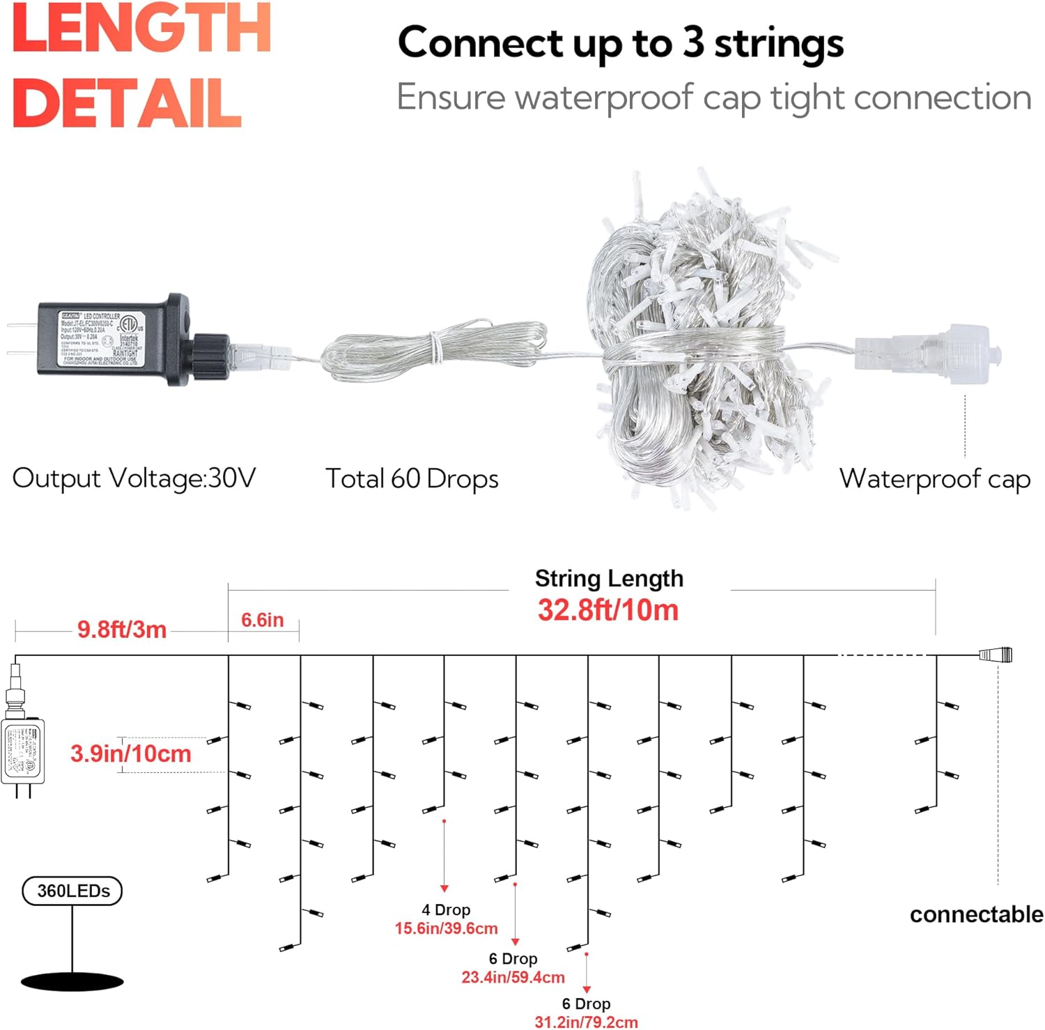 - 💝【Led Christmas Icicle Lights】:Hopolon icicle Christmas lights adopt 360L bright led bulbs,42.6ft total length(Wire with light 32.8ft+Lead wire 9.8ft) with 60 drops.Drop lengths 16''- 24''- 31''- 24'', number of light bulbs is 4, 6, 8, and 6 respectively.Hanging our red icicle christmas lights to create warm and romantic atmosphere for you.