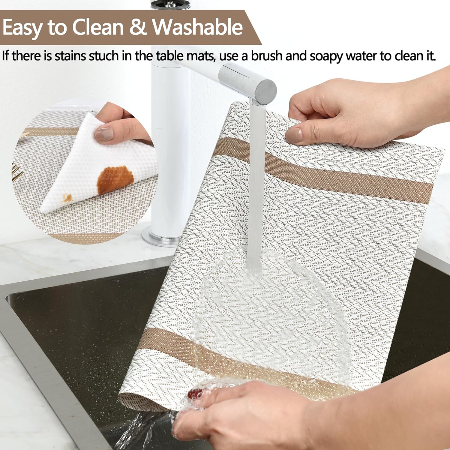 - Easy to Clean: Washable placemats easy to clean, water and oil proof, hand wash in warm soapy water and wipe dry, if there is stains stuch in the table mats, use a brush and soapy water to clean the placemats. It is recommended to clean in time after dinner. Size: 17.7x12 Inch. Products are handmade and measured, there may be 0.4 in plus or minus size error