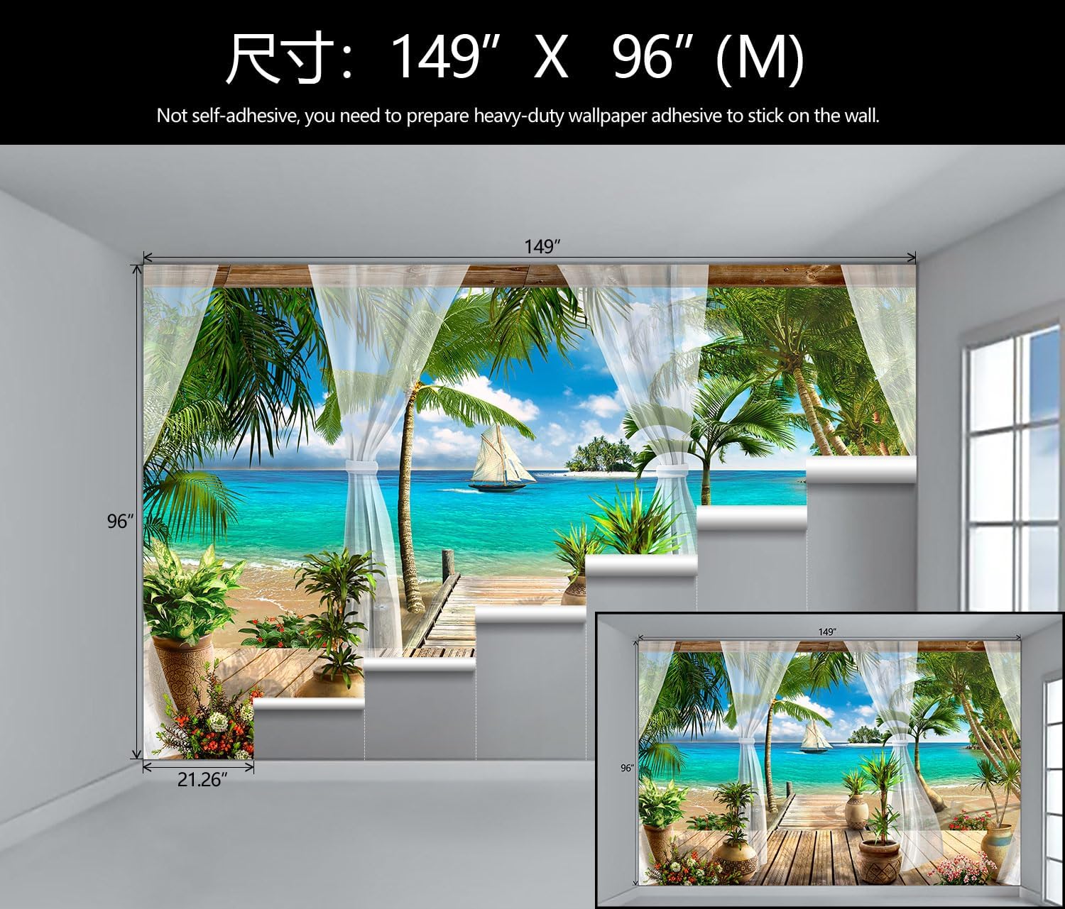 - Mural Size: The total size of this mural wallpaper is 149" x 96" / 378CM x 244CM (W x H), cut into 7 pieces, each measuring 21.26" x 96", for easy installation.