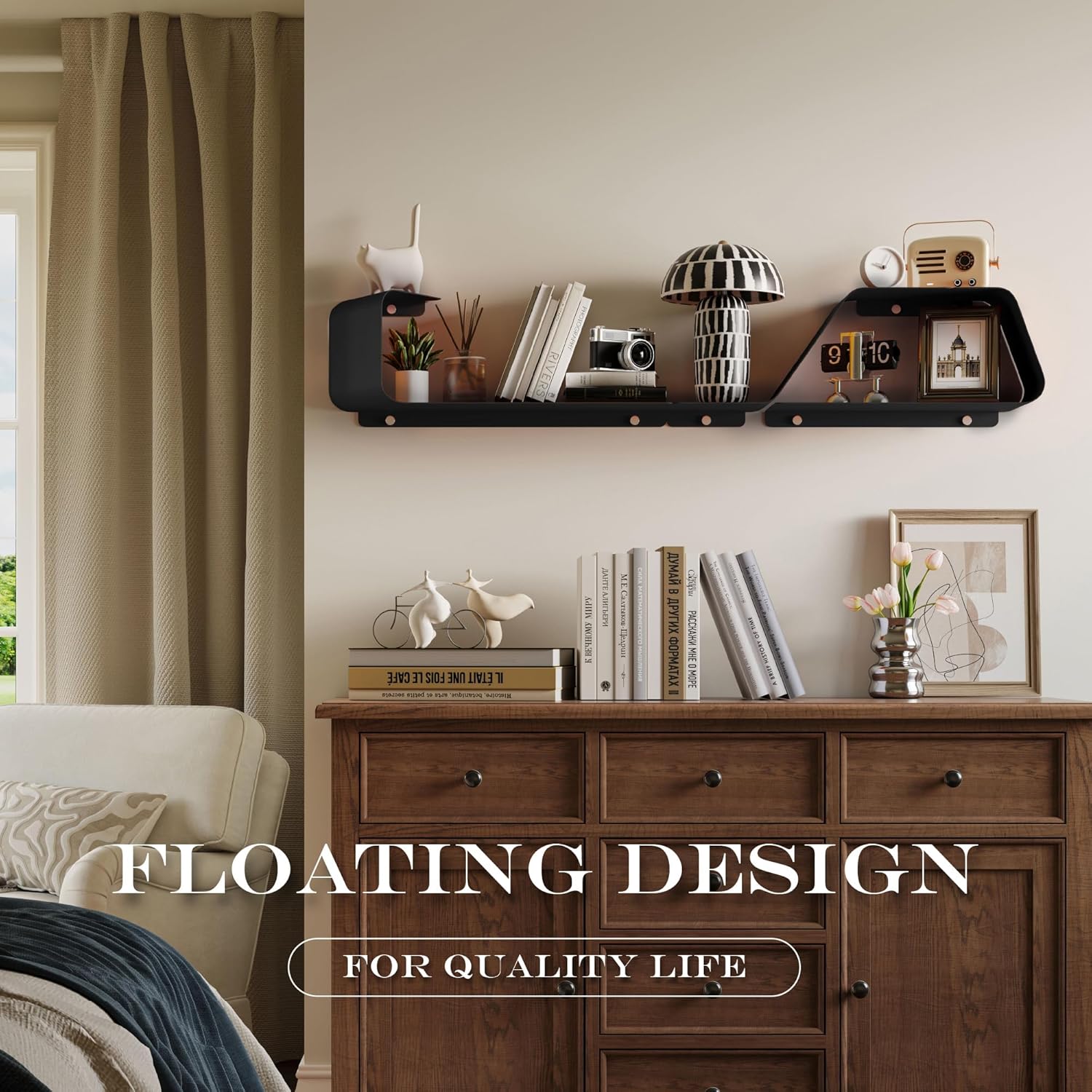 - Multifunctional Floating Shelf: This unique piece offers an inventive design flexible configuration to fit any size of wall space. Transform wasted wall space into a spacious storage area. These shelves, a bedroom showcase for prized items, a living room display for photos, a bathroom organizer for toiletries, or a kitchen rack for spices and so on. It doesn't just offer organization, it elevates your living space, redefining the aesthetic of your home.