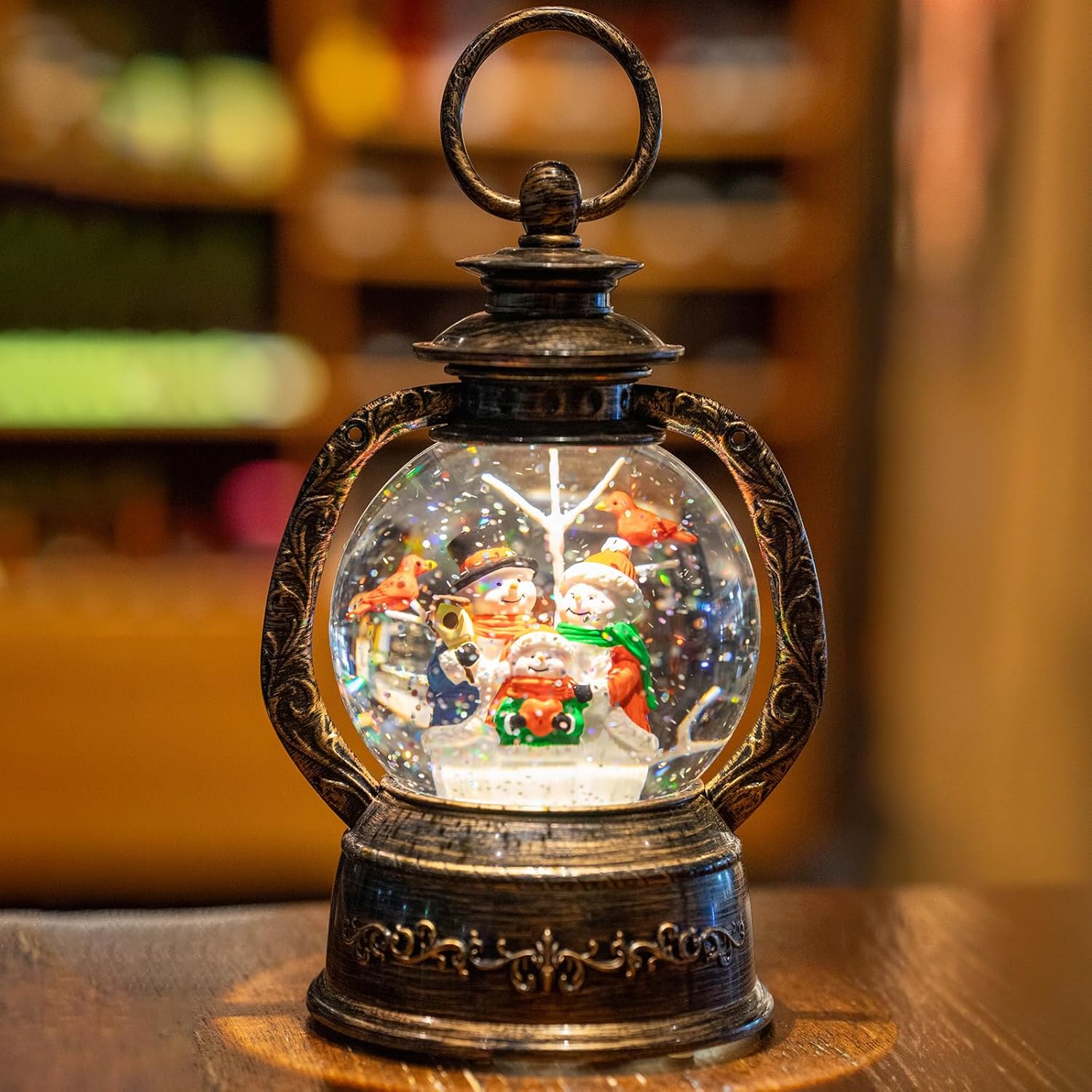 - 🎅🎄【Snow Globe Lantern】The lovely snowman family design, When turned on a warm LED shines on the figurine and swirling glitter to gives our Christmas globe a whimsical look for the Christmas Holiday season.