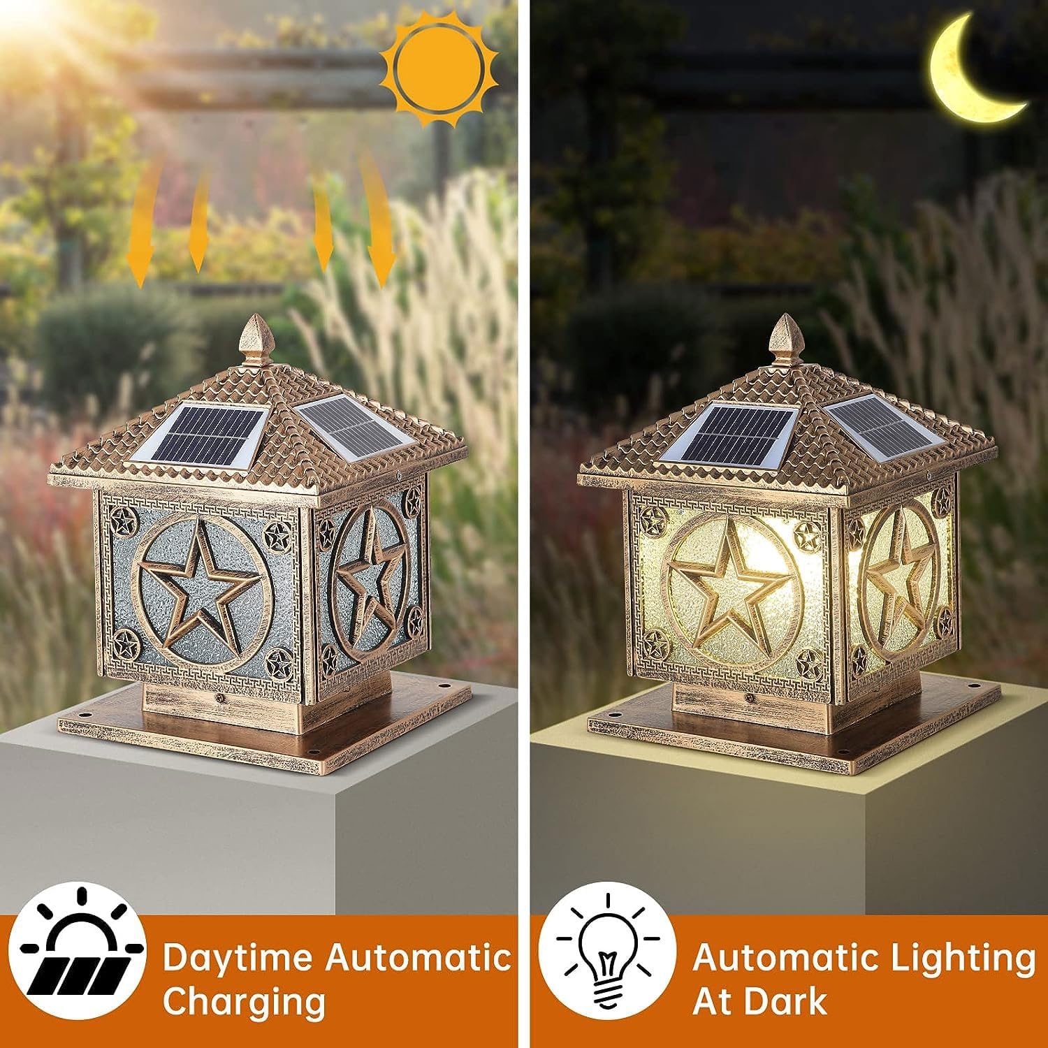 - 【High Quality Solar Post Light】: MODERN EXTERIOR POST LANTERN, This outdoor post lighting is made of thickened die cast aluminum ensures durability and reliability, and The solar panel absorbs the light source and converts it into a power source, without the need to connect the power cord, it can be easily fixed and installed.