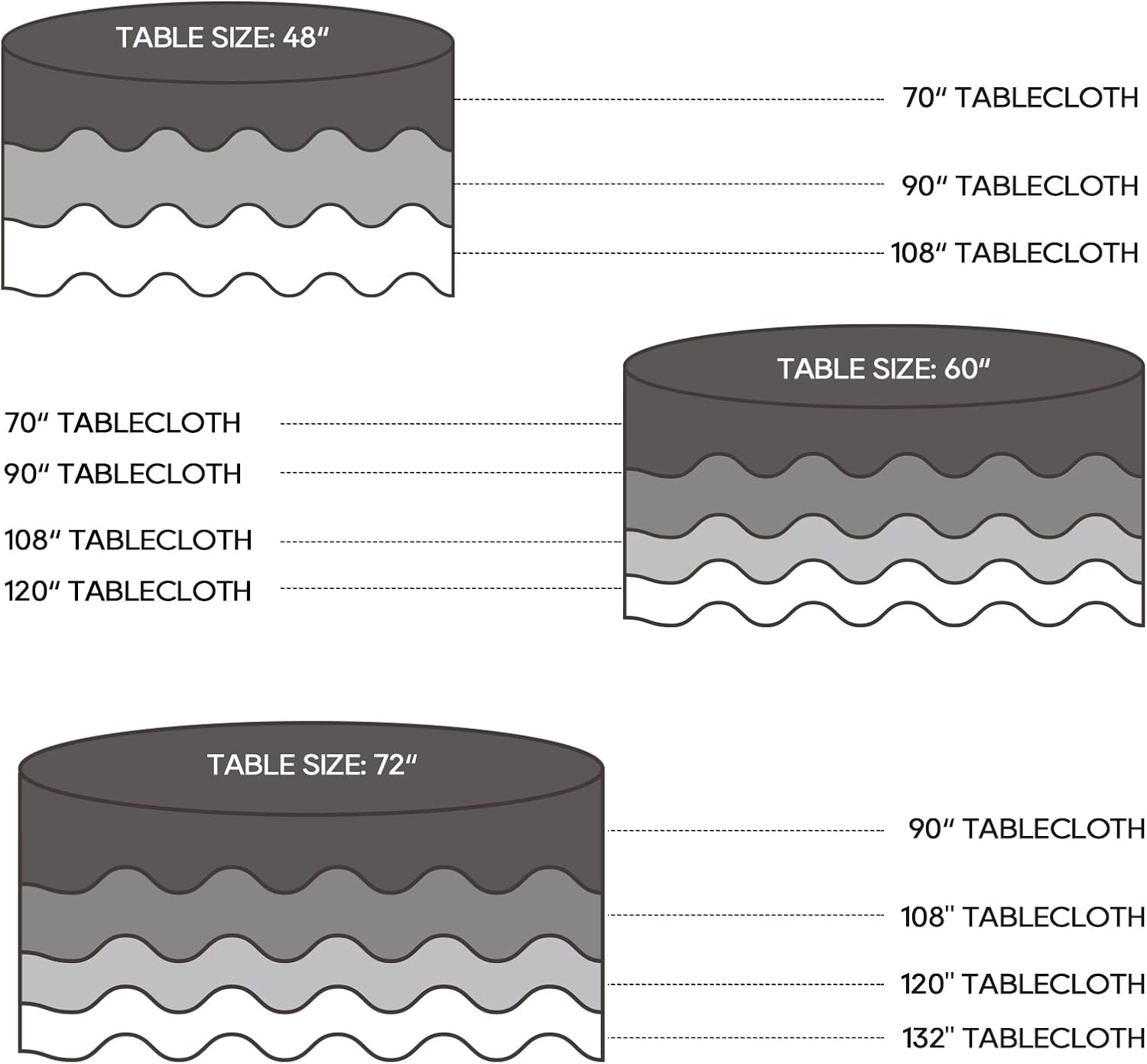 - Perfect size: This white tablecloth for round tables is available in a variety of sizes to choose from, perfect to meet a variety of needs. Note: please measure the length of the table and reserve the length of the hem before purchase