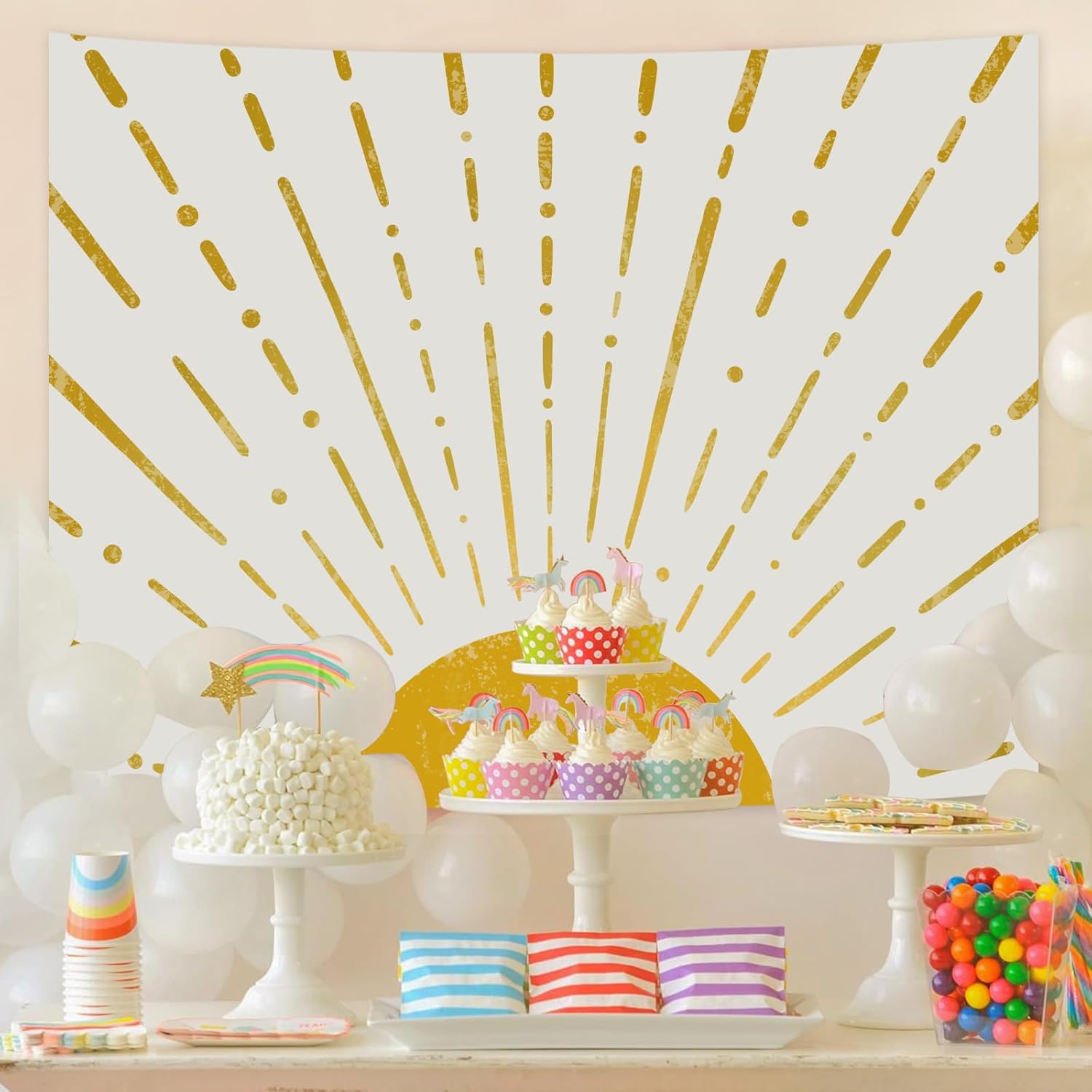 Kanuyee Gold Boho Burning Sun Tapestry Wall Hanging, Retro 70s Abstract Vintage Geometric Line Sunrise Tapestries for Bedroom Living Room Backdrop 60×80 inch