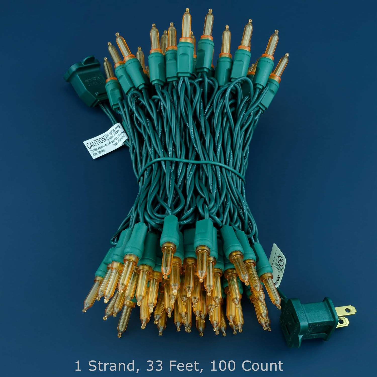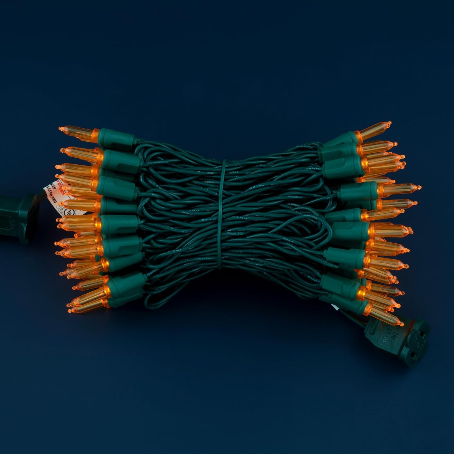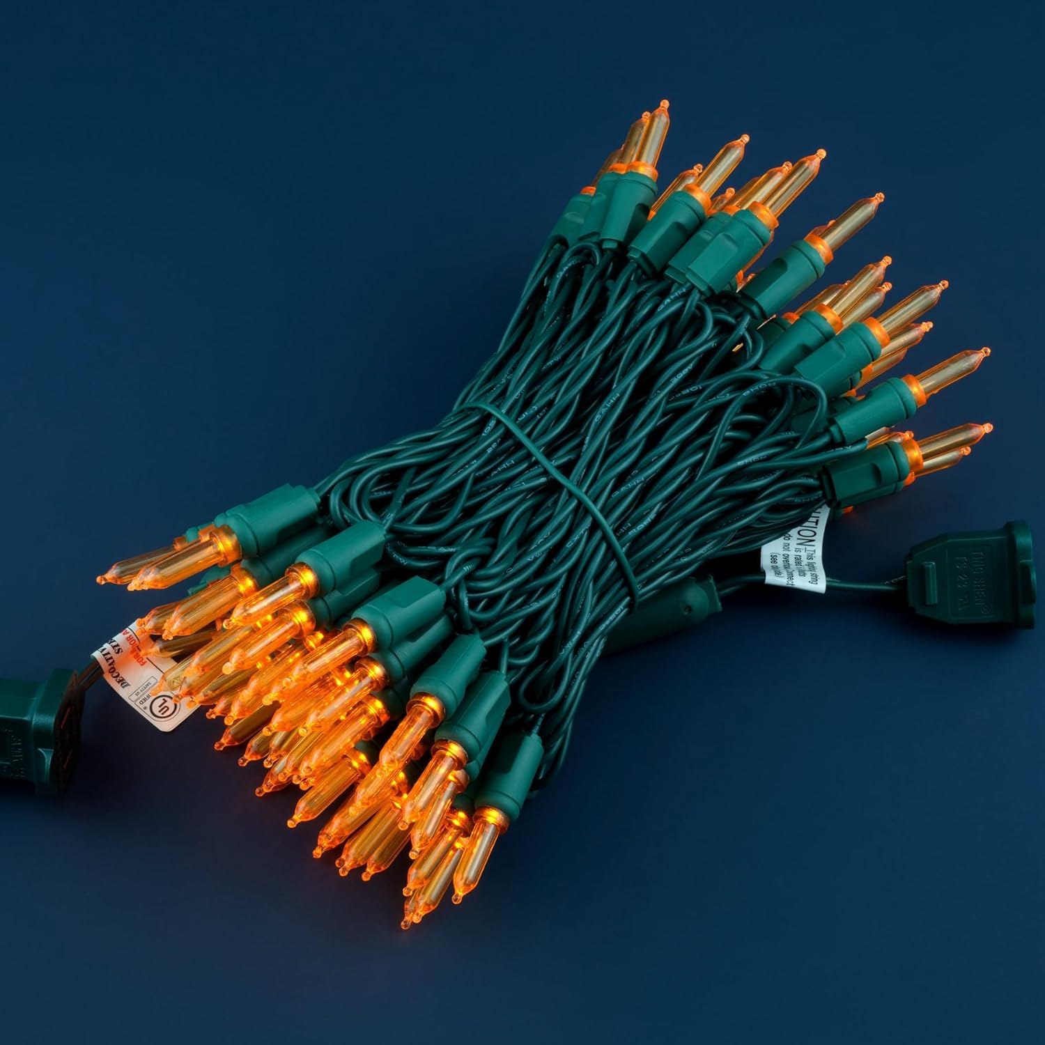 - SPECIFICATIONS β Each pack contains 1 strands of one-piece string lights, total length 33 feet with 100 count orange mini lights. 22 AWG green cord, 4" lead, 4" spacing, 4" tail.