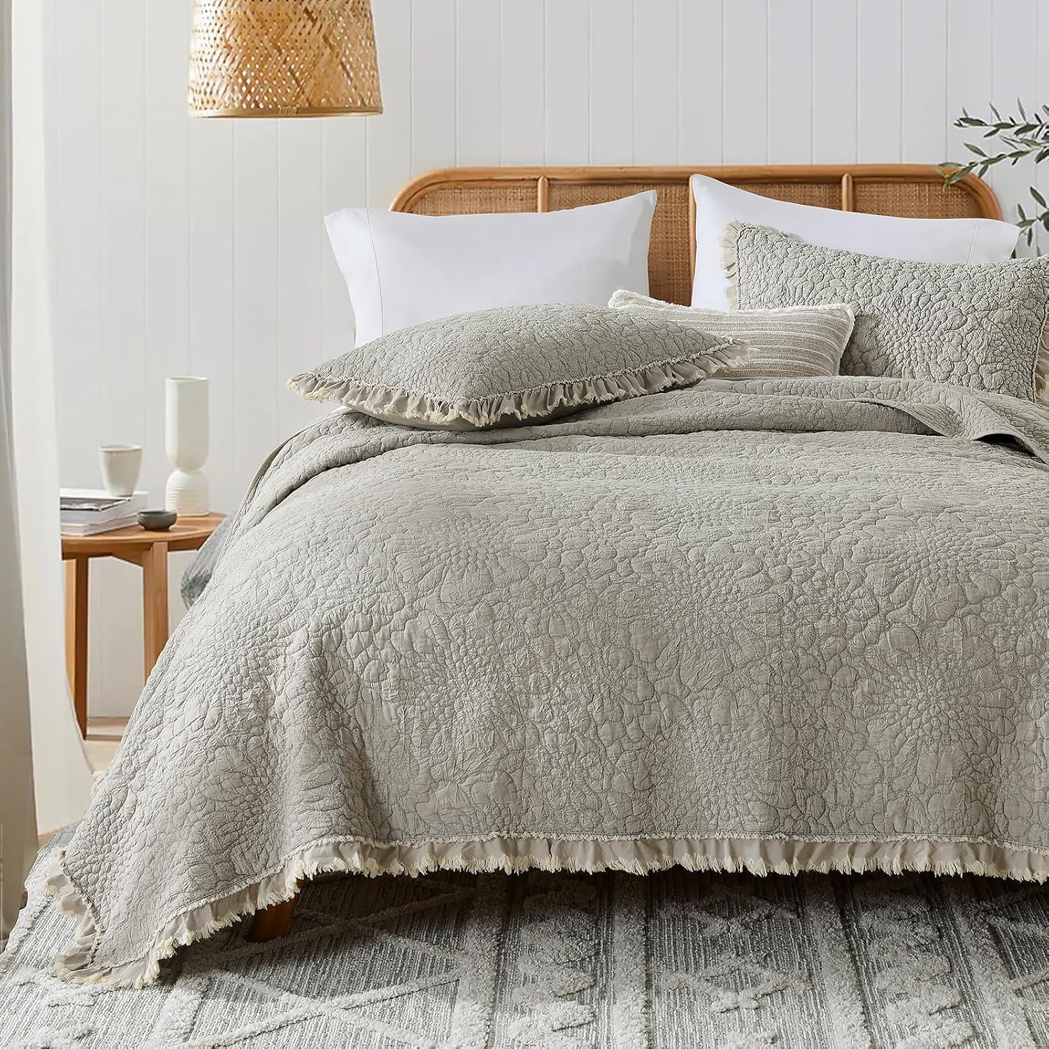 HORIMOTE HOME Beige Ruffled Quilt King Size, Stone-Washed Microfiber Lightweight Crinkled Farmhouse Rustic Shabby Chic Bedding Set, 3 Pieces Reversible Bedspread with Pillow Shams for All Season
