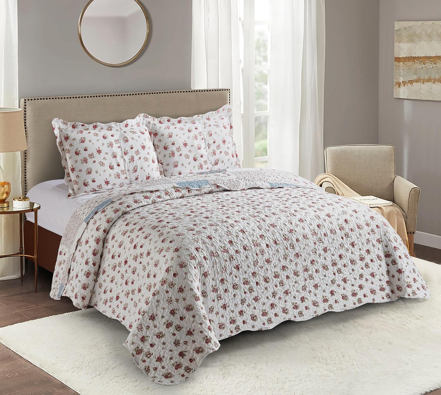 Brilliant Sunshine Pink Rose with Small Blue Check Patchwork, 3-Piece Quilt Set with 2 Shams, Reversible Bedspread, Soft Lightweight Coverlet, All-Season, Full/Queen, Pink Blue