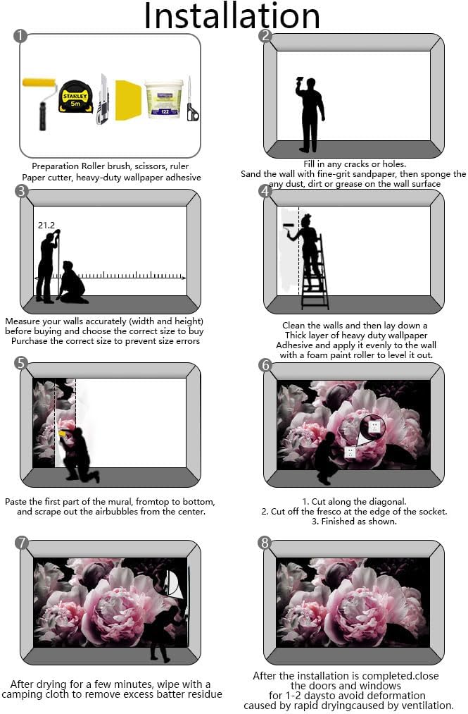 - Installation steps 1. Fill in any cracks or holes and clean the surface of the wall of dust, dirt and grease.2. Apply heavy-duty wallpaper paste to the wall, not the mural.3. Mark the position of each strip of wallpaper with a spirit level.4. Align the pattern and slide it into place.5. Scrape the bubbles with a spatula.6. Let it dry for a couple of minutes and it's ready to go!