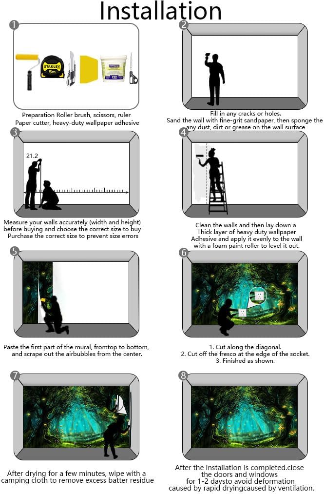 - Installation steps 1. Fill in any cracks or holes and clean the surface of the wall of dust, dirt and grease.2. Apply heavy-duty wallpaper paste to the wall, not the mural.3. Mark the position of each strip of wallpaper with a spirit level.4. Align the pattern and slide it into place.5. Scrape the bubbles with a spatula.6. Let it dry for a couple of minutes and it's ready to go!