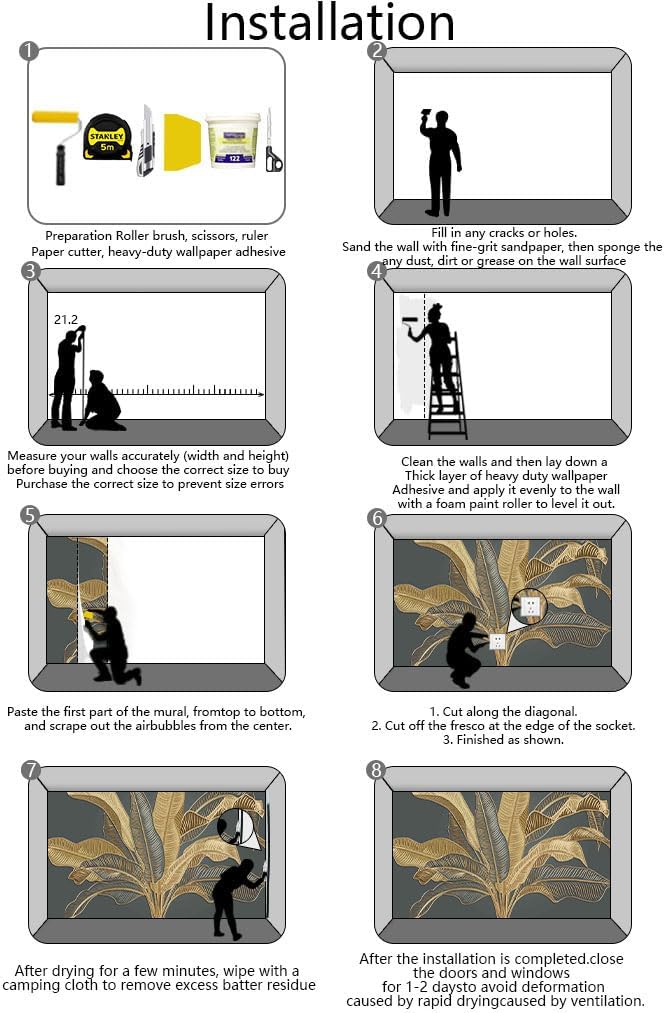 - Installation steps 1. Fill in any cracks or holes and clean the surface of the wall of dust, dirt and grease.2. Apply heavy-duty wallpaper paste to the wall, not the mural.3. Mark the position of each strip of wallpaper with a spirit level.4. Align the pattern and slide it into place.5. Scrape the bubbles with a spatula.6. Let it dry for a couple of minutes and it's ready to go!