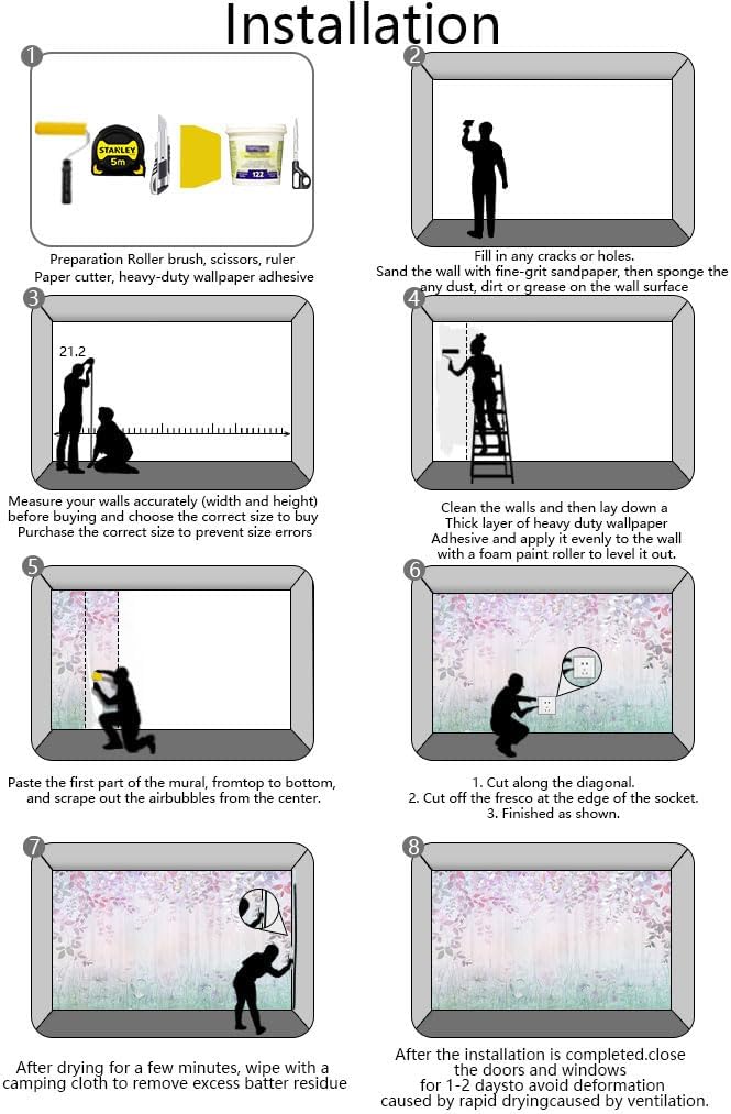 - Installation steps 1. Fill in any cracks or holes and clean the surface of the wall of dust, dirt and grease.2. Apply heavy-duty wallpaper paste to the wall, not the mural.3. Mark the position of each strip of wallpaper with a spirit level.4. Align the pattern and slide it into place.5. Scrape the bubbles with a spatula.6. Let it dry for a couple of minutes and it's ready to go!