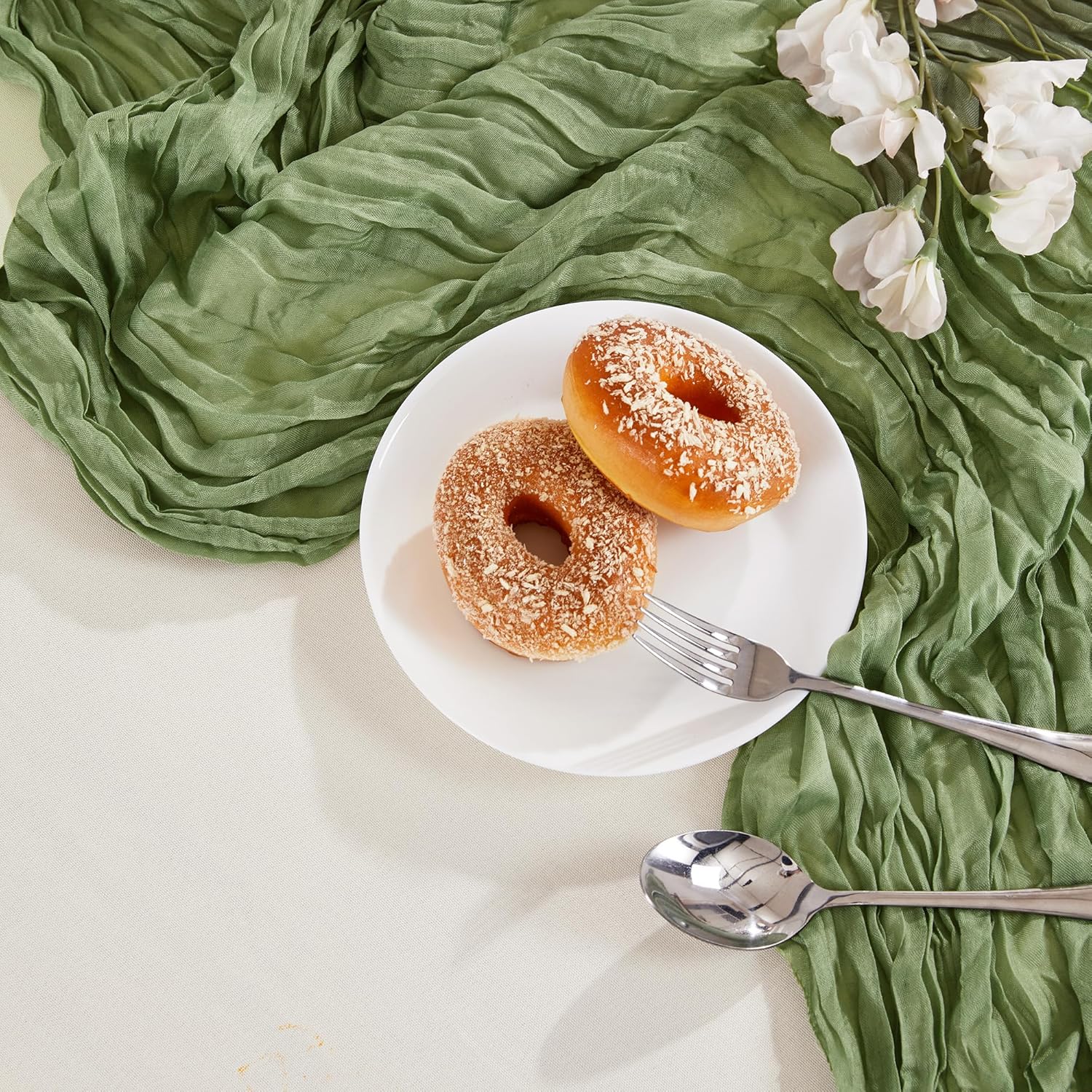 - PACKAGE INCLUDED: You will receive 24 pieces of sage green cheesecloth table runners. Elegant and beautiful design, exquisite workmanship. Product size: Each boho table runner is 35 x 120 inches. Enough to cover rectangles and round tables, as well as long tables that are stitched together. It can even be used to belt chairs decorate napkins, background curtains. Round or square tables for 8-10 people, perfect for romantic and elegant party events
