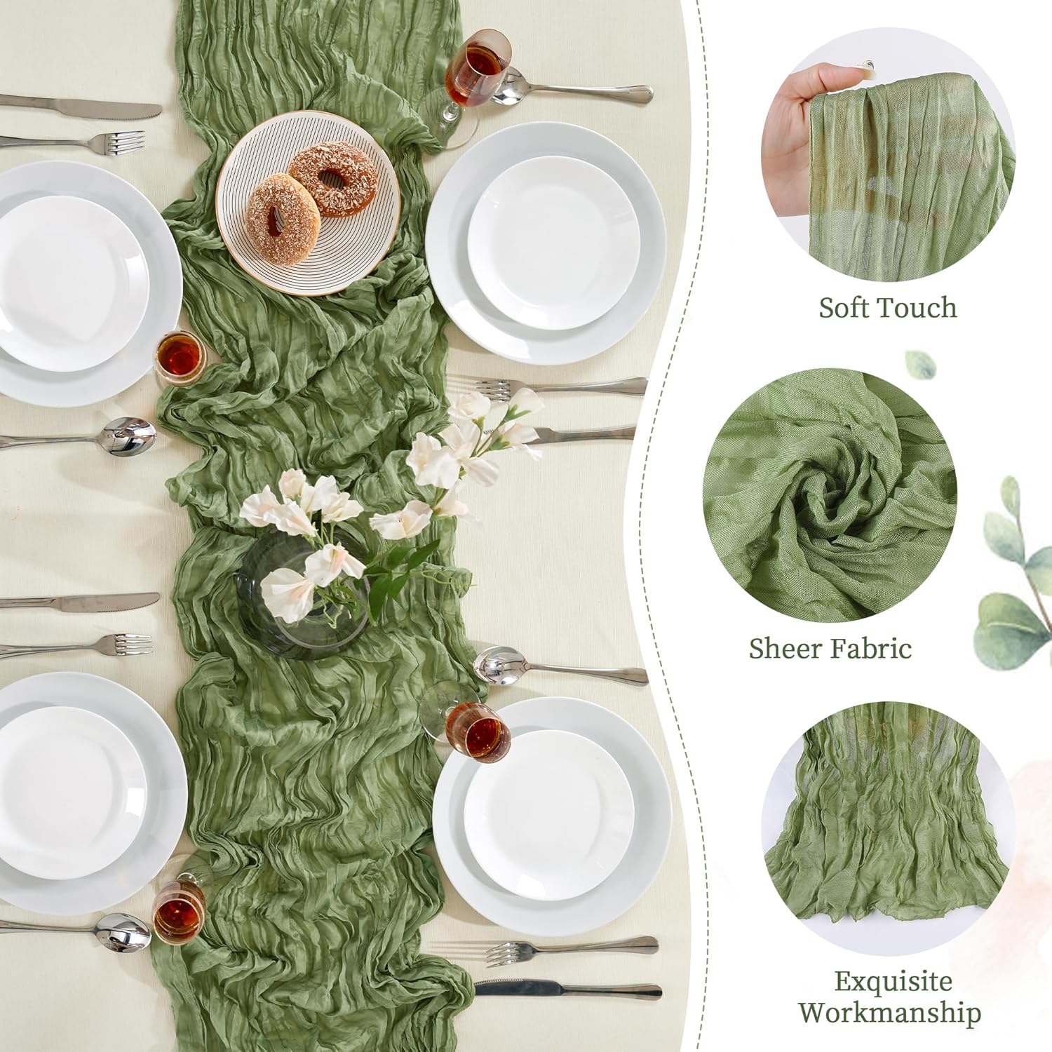 - PACKAGE INCLUDED: You will receive 12 pieces of sage green cheesecloth table runners. Elegant and beautiful design, exquisite workmanship. Product size: Each boho table runner is 35 x 120 inches. Enough to cover rectangles and round tables, as well as long tables that are stitched together. It can even be used to belt chairs decorate napkins, background curtains. Round or square tables for 8-10 people, perfect for romantic and elegant party events