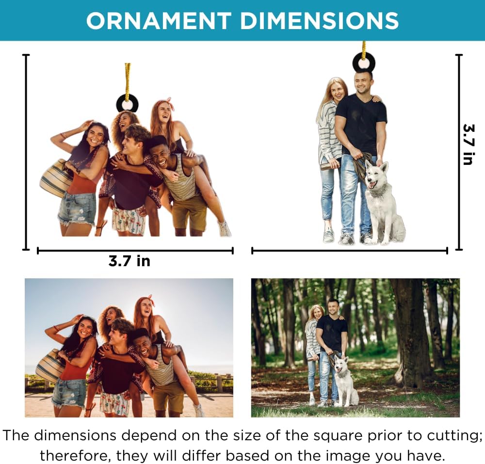 - π Custom Ornaments With Pictures: Crafted with high-quality acrylic, this ornament features a height of 3.7 inches (~9.5 cm) and a slim 0.12" thickness, ensuring its durability and lightweight design. The ornament can be customized with your photo, which makes it a truly personal and cherished gift. We include a hanging gold cord loop to easily hang on your Christmas tree or an ornament stand.