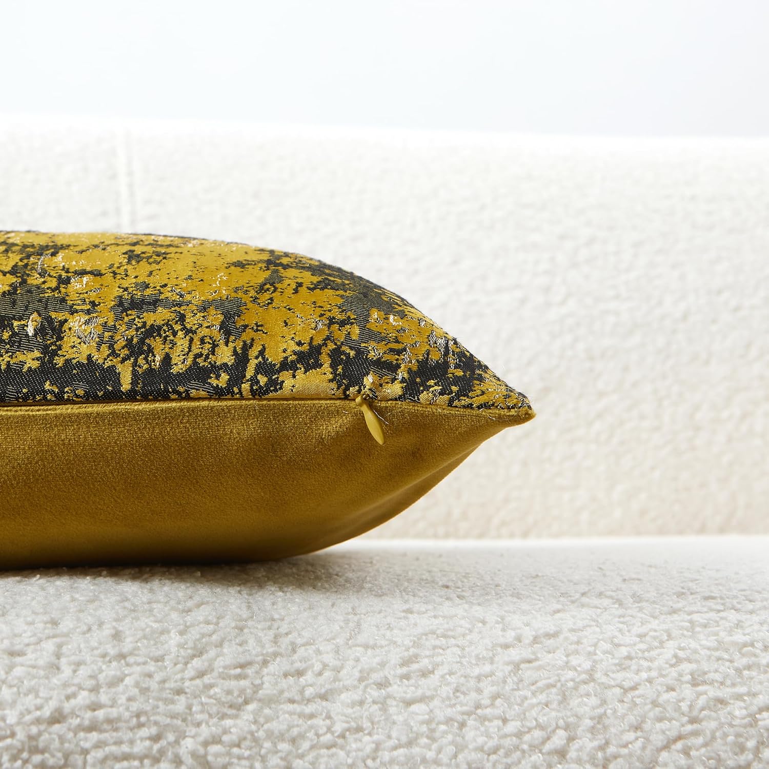 - Premium Jacquard & Velvet Pillow Cover : Crafted with luxe 70% polyester 30% viscose jacquard weave in Sun Gold & Black - a striking interplay of warm metallic gold and rich onyx threads that creates a contemporary luxe glow. The reverse features 100% polyester cream beige velvet in sumptuous cloud-soft texture. Two looks in one - Instantly elevates sofas, beds, or accent chairs—perfect for holiday glamour or everyday luxury.